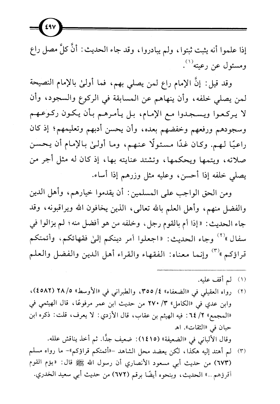 (¬3) لم أهتد إليه هكذا، لكن يعضد محل الشاهد -"أئمتكم قراؤكم"- ما رواه مسلم (673) من حديث أبي مسعود الأنصاري أن رسول اللَّه -صلى اللَّه عليه وسلم- قال: "يؤم القوم أقرؤهم. . " الحديث، وبنحوه أيضًا برقم (672) من حديث أبي سعيد الخدري.