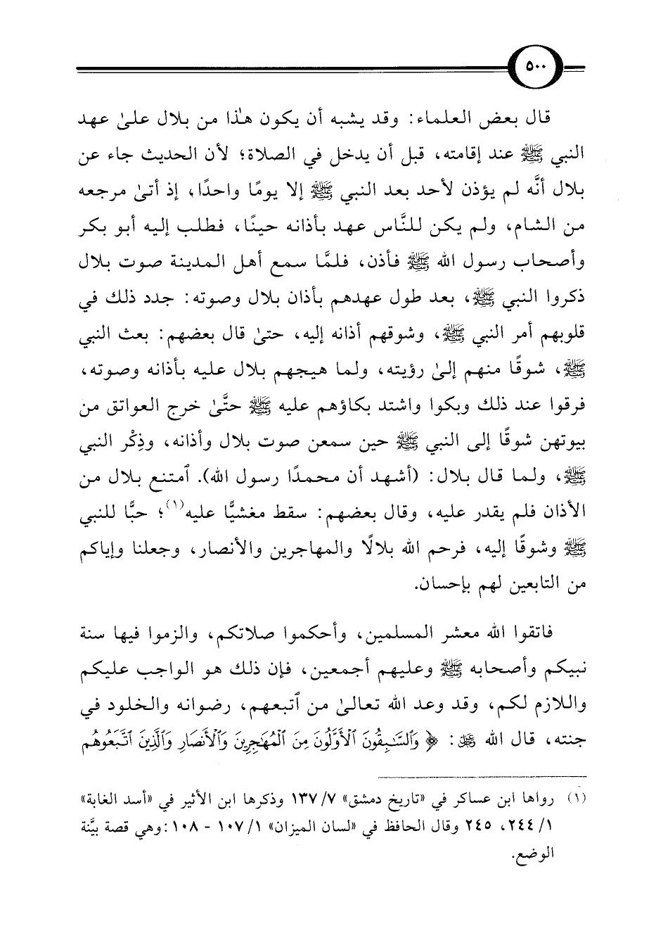 قال بعض العلماء: وقد يشبه أن يكون هذا من بلال على عهد النبي -صلى اللَّه عليه وسلم- عند إقامته، قبل أن يدخل في الصلاة؛ لأن الحديث جاء عن بلال أنَّه لم يؤذن لأحد بعد النبي -صلى اللَّه عليه وسلم- إلا يومًا واحدًا؛ إذ أتى مرجعه من الشام، ولم يكن للنَّاس عهد بأذانه حينًا، فطلب إليه أبو بكر وأصحاب رسول اللَّه -صلى اللَّه عليه وسلم- فأذن، فلمَّا سمع أهل المدينة صوت بلال ذكروا النبي -صلى اللَّه عليه وسلم-، بعد طول عهدهم بأذان بلال وصوته: جدد ذلك في قلوبهم أمر النبي -صلى اللَّه عليه وسلم-، وشوقهم أذانه إليه، حتى قال بعضهم: بعث النبي -صلى اللَّه عليه وسلم-، شوقًا منهم إلى رؤيته، ولما هيجهم بلال عليه بأذانه وصوته، فرقوا عند ذلك وبكوا واشتد بكاؤهم عليه -صلى اللَّه عليه وسلم- حتَّى خرج العواتق من بيوتهن شوقًا إلى النبي -صلى اللَّه عليه وسلم- حين سمعن صوت بلال وأذانه، وذِكْر النبي -صلى اللَّه عليه وسلم-، ولما قال بلال: (أشهد أن محمدًا رسول اللَّه). امتنع بلال من الأذان فلم يقدر عليه، وقال بعضهم: سقط مغشيًّا عليه (¬1)؛ حبًّا للنبي -صلى اللَّه عليه وسلم- وشوقًا إليه، فرحم اللَّه بلالًا والمهاجرين والأنصار، وجعلنا وإياكم من التابعين لهم بإحسان.