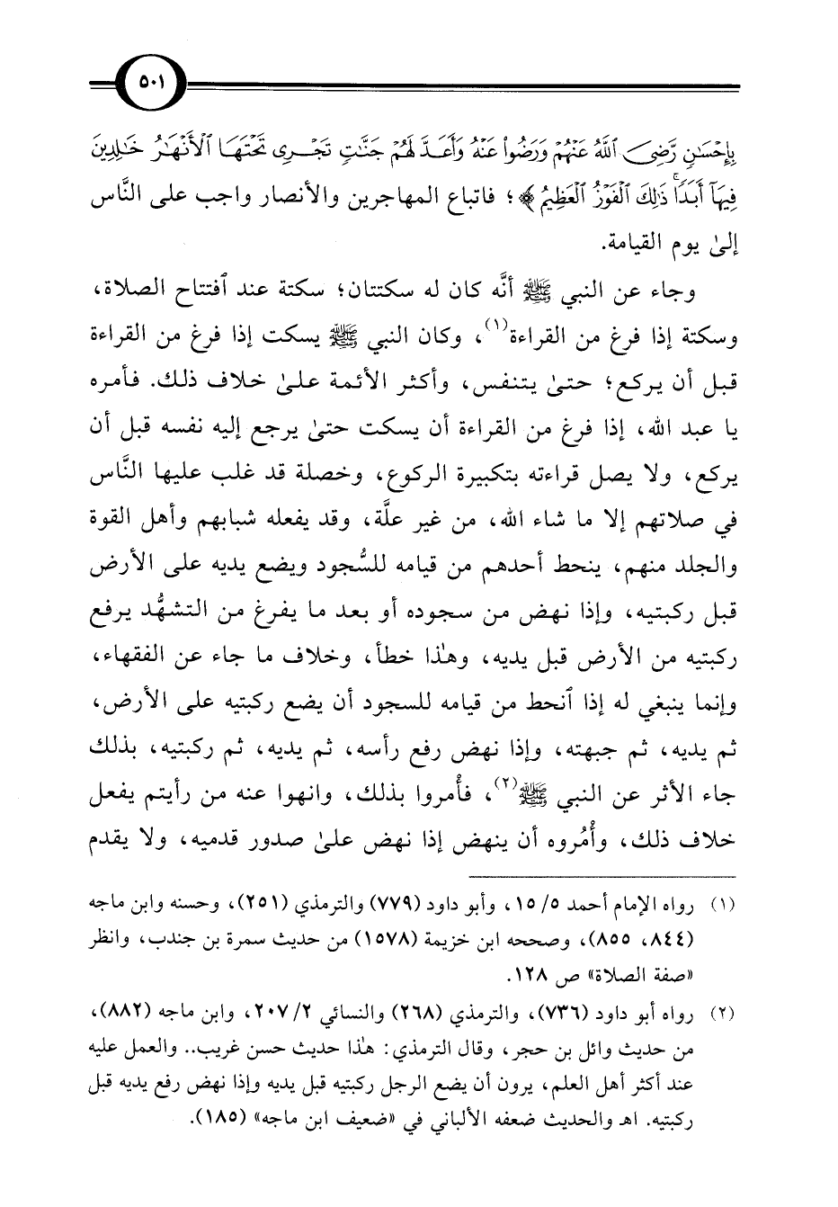 (¬1) رواه الإمام أحمد 5/ 15، وأبو داود (779) والترمذي (251)، وحسنه وابن ماجه (844، 855)، وصححه ابن خزيمة (1578) من حديث سمرة بن جندب، وانظر "صفة الصلاة" ص 128.