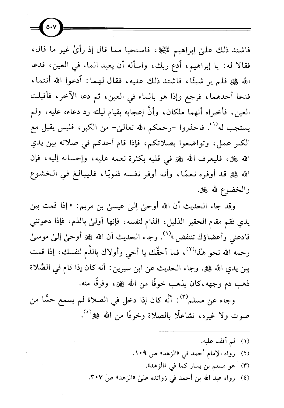 فاشتد ذلك على إبراهيم عليه السلام، فاستحيا مما قال إذ رأى غير ما قال، فقالا له: يا إبراهيم، ادع ربك، واسأله أن يعيد الماء في العين، فدعا اللَّه عز وجل فلم ير شيئًا، فاشتد ذلك عليه، فقال لهما: ادعوا اللَّه أنتما، فدعا أحدهما، فرجع وإذا هو بالماء في العين، ثم دعا الآخر، فأقبلت العين، فأخبراه أنهما ملكان، وأنَّ إعجابه بقيام ليلته رد دعاءه عليه، ولم يستجب له (¬1). فاحذروا -رحمكم اللَّه تعالى- من الكبر، فليس يقبل مع الكبر عمل، وتواضعوا بصلاتكم، فإذا قام أحدكم في صلاته بين يدي اللَّه عز وجل، فليعرف اللَّه عز وجل في قلبه بكثرة نعمه عليه، وإحسانه إليه، فإن اللَّه عز وجل قد أوفره نعمًا، وأنه أوفر نفسه ذنوبًا، فليبالغ في الخشوع والخضوع للَّه عز وجل.