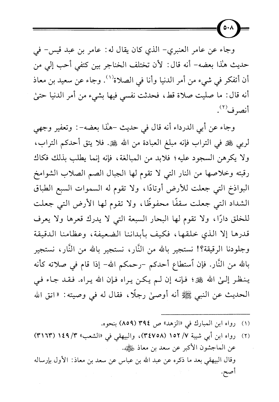 وجاء عن أبي الدرداء أنه قال في حديث -هذا بعضه-: وتعفير وجهي لربي عَزَّ وَجَلَّ في التراب فإنه مبلغ العبادة من اللَّه عَزَّ وَجَلَّ فلا يتق أحدكم التراب، ولا يكرهن السجود عليه؛ فلابد من المبالغة، فإنه إنما يطلب بذلك فكاك رقبته وخلاصها من النار التي لا تقوم لها الجبال الصم الصلاب الشوامخ البواذخ التي جعلت للأرض أوتادًا، ولا تقوم له السموات السبع الطباق الشداد التي جعلت سقفًا محفوظًا، ولا تقوم لها الأرض التي جعلت للخلق دارًا، ولا تقوم لها البحار السبعة التي لا يدرك قعرها ولا يعرف قدرها إلا الذي خلقها، فكيف بأبداننا الضعيفة، وعظامنا الدقيقة وجلودنا الرقيقة؟ ! نستجير باللَّه من النَّار، نستجير باللَّه من النَّار، نستجير باللَّه من النَّار. فإن استطاع أحدكم -رحمكم اللَّه- إذا قام في صلاته كأنه ينظر إلى اللَّه عز وجل؛ فإنه إن لم يكن يراه فإن اللَّه يراه. فقد جاء في الحديث عن النبي -صلى اللَّه عليه وسلم- أنه أوصى رجلًا، فقال له في وصيته: "اتق اللَّه