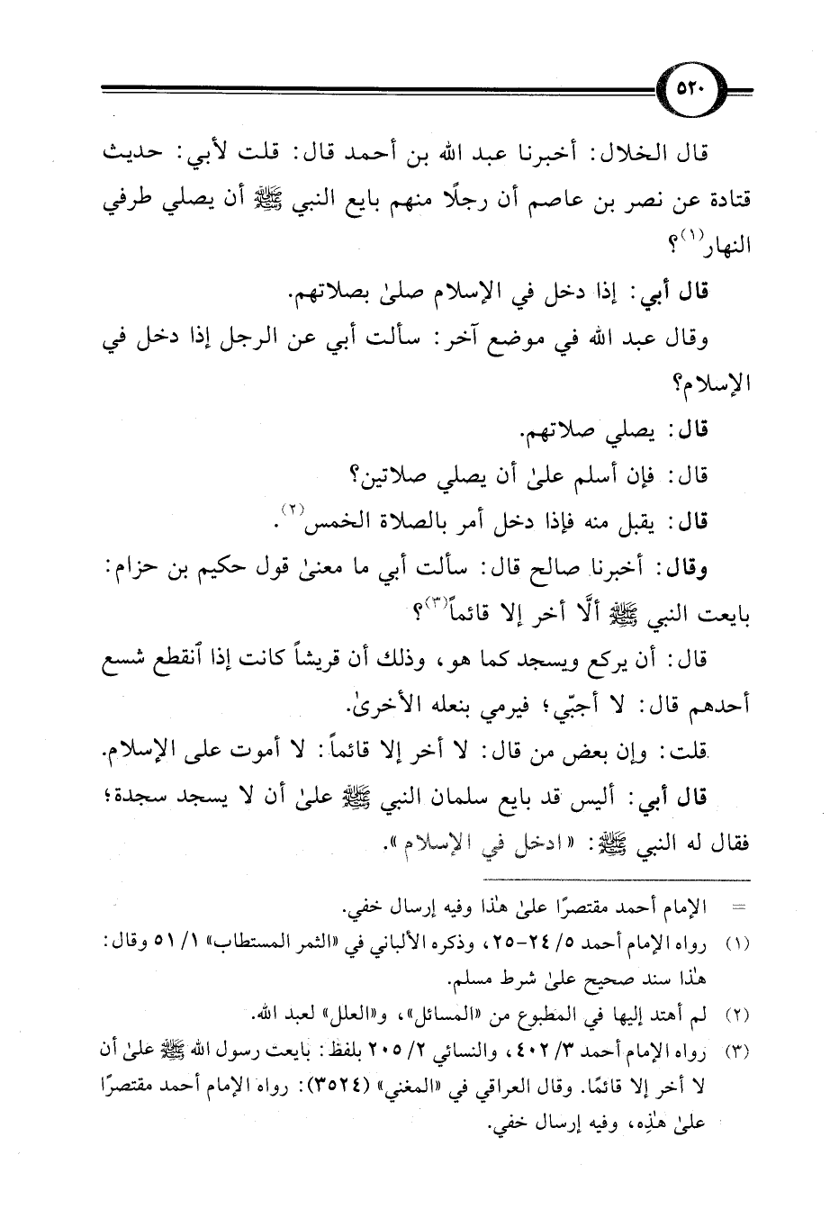 قال الخلال: أخبرنا عبد اللَّه بن أحمد قال: قلت لأبي: حديث قتادة عن نصر بن عاصم أن رجلًا منهم بايع النبي -صلى اللَّه عليه وسلم- أن يصلي طرفي النهار (¬1)؟