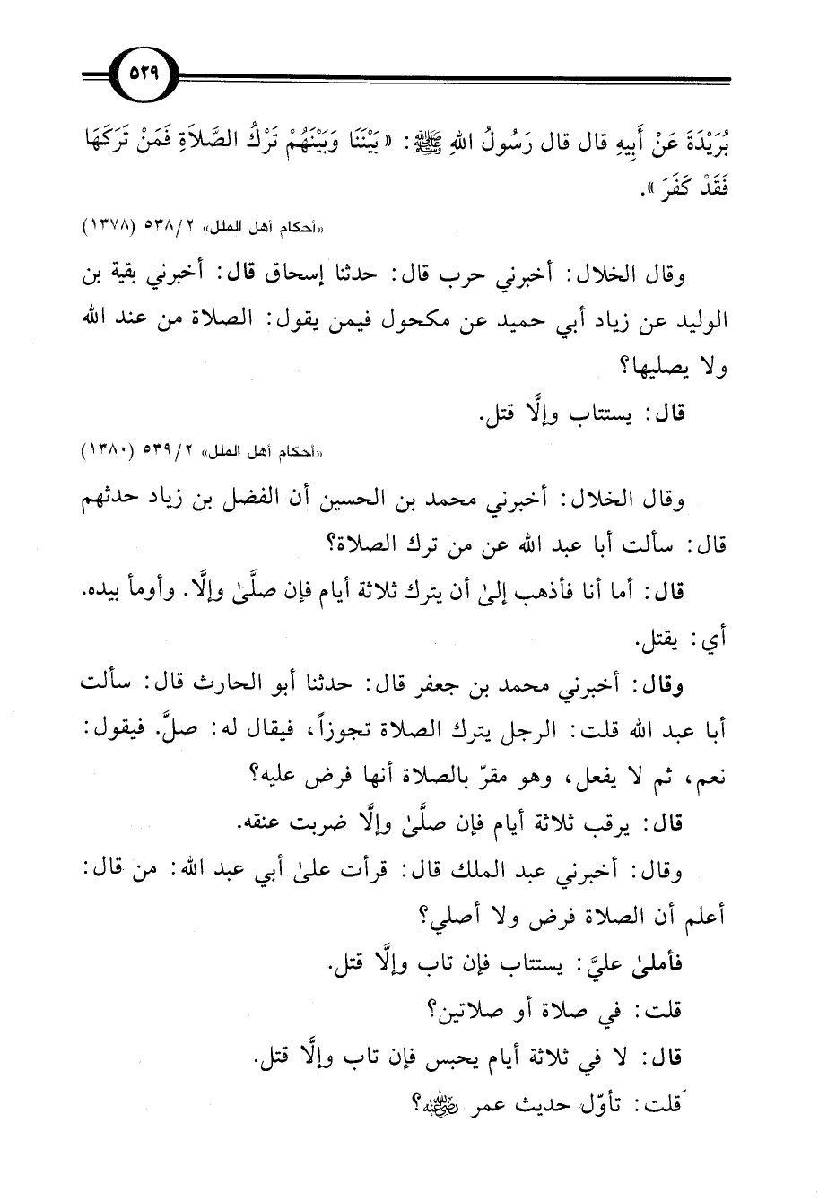 وقال الخلال: أخبرني محمد بن الحسين أن الفضل بن زياد حدثهم قال: سألت أبا عبد اللَّه عن من ترك الصلاة؟