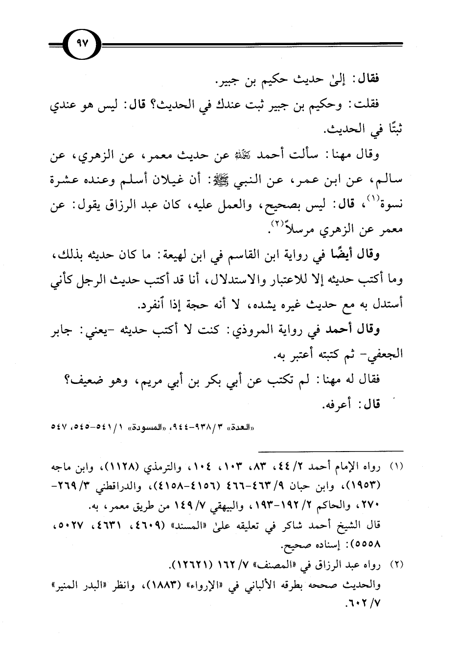 وقال مهنا: سألت أحمد رحمه اللَّه عن حديث معمر، عن الزهري، عن سالم، عن ابن عمر، عن النبي -صلى اللَّه عليه وسلم-: أن غيلان أسلم وعنده عشرة (¬1) نسوة، قال: ليس بصحيح، والعمل عليه، كان عبد الرزاق يقول: عن معمر عن الزهري مرسلًا (¬2).