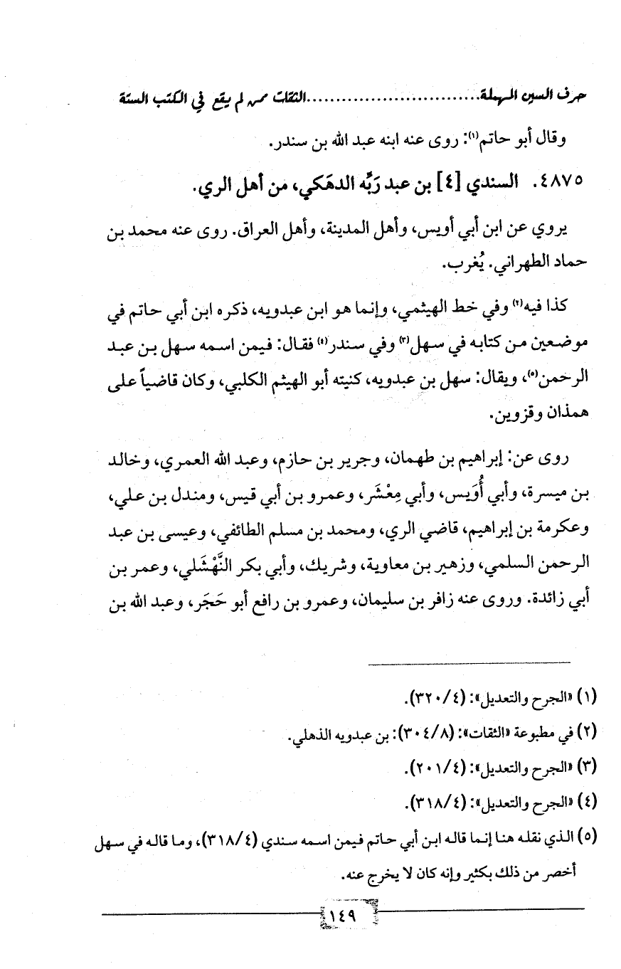 (¬5) الذي نقله هنا إنما قاله ابن أبي حاتم فيمن اسمه سندي (4/ 318)، وما قاله في سهل أخصر من ذلك بكثير وإنه كان لا يخرج عنه.