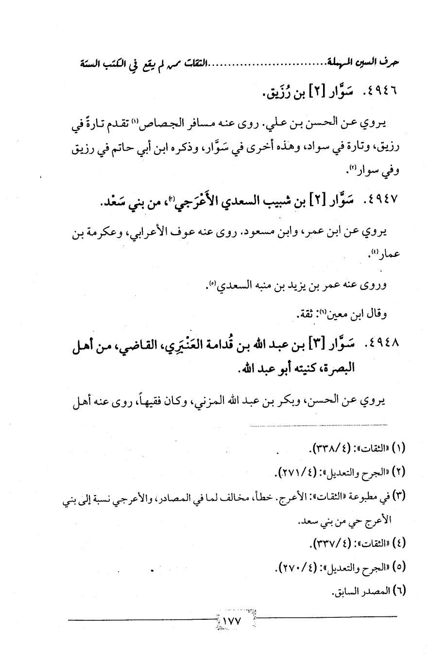 4948 - سَوَّار [3] بن عبد الله بن قُدامة العَنْبَرِي، القاضي، من أهل البصرة، كنيته أبو عبد الله.