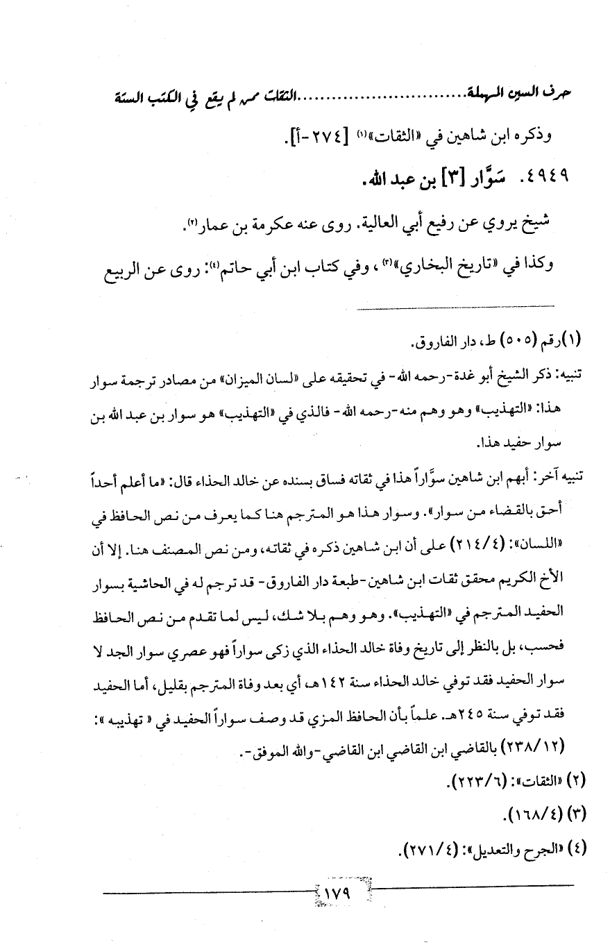تنبيه آخر: أبهم ابن شاهين سوَّاراً هذا في ثقاته فساق بسنده عن خالد الحذاء قال: «ما أعلم أحداً أحق بالقضاء من سوار». وسوار هذا هو المترجم هنا كما يعرف من نص الحافظ في «اللسان»: (4/ 214) على أن ابن شاهين ذكره في ثقاته، ومن نص المصنف هنا. إلا أن الأخ الكريم محقق ثقات ابن شاهين-طبعة دار الفاروق- قد ترجم له في الحاشية بسوار الحفيد المترجم في «التهذيب». وهو وهم بلا شك، ليس لما تقدم من نص الحافظ فحسب، بل بالنظر إلى تاريخ وفاة خالد الحذاء الذي زكى سواراً فهو عصري سوار الجد لا سوار الحفيد فقد توفي خالد الحذاء سنة 142هـ، أي بعد وفاة المترجم بقليل، أما الحفيد فقد توفي سنة 245هـ. علماً بأن الحافظ المزي قد وصف سواراً الحفيد في «تهذيبه»: (12/ 238) بالقاضي ابن القاضي ابن القاضي-والله الموفق-.