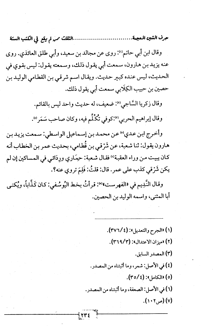 وأخرج ابن عدي (¬5) عن محمد بن إسماعيل الواسطي: سمعت يزيد بن هارون يقول: ثنا شعبة، عن شَرْقي بن قُطامي، بحديث عمر بن الخطاب أنه كان يبيت من وراء العقبة (¬6) فقال شعبة: حِمَاري ورِدَائي في المساكين إن لم يكن شَرْقي كذب على عمر. قال: قلتُ: فَلِمَ تروي عنه؟.
