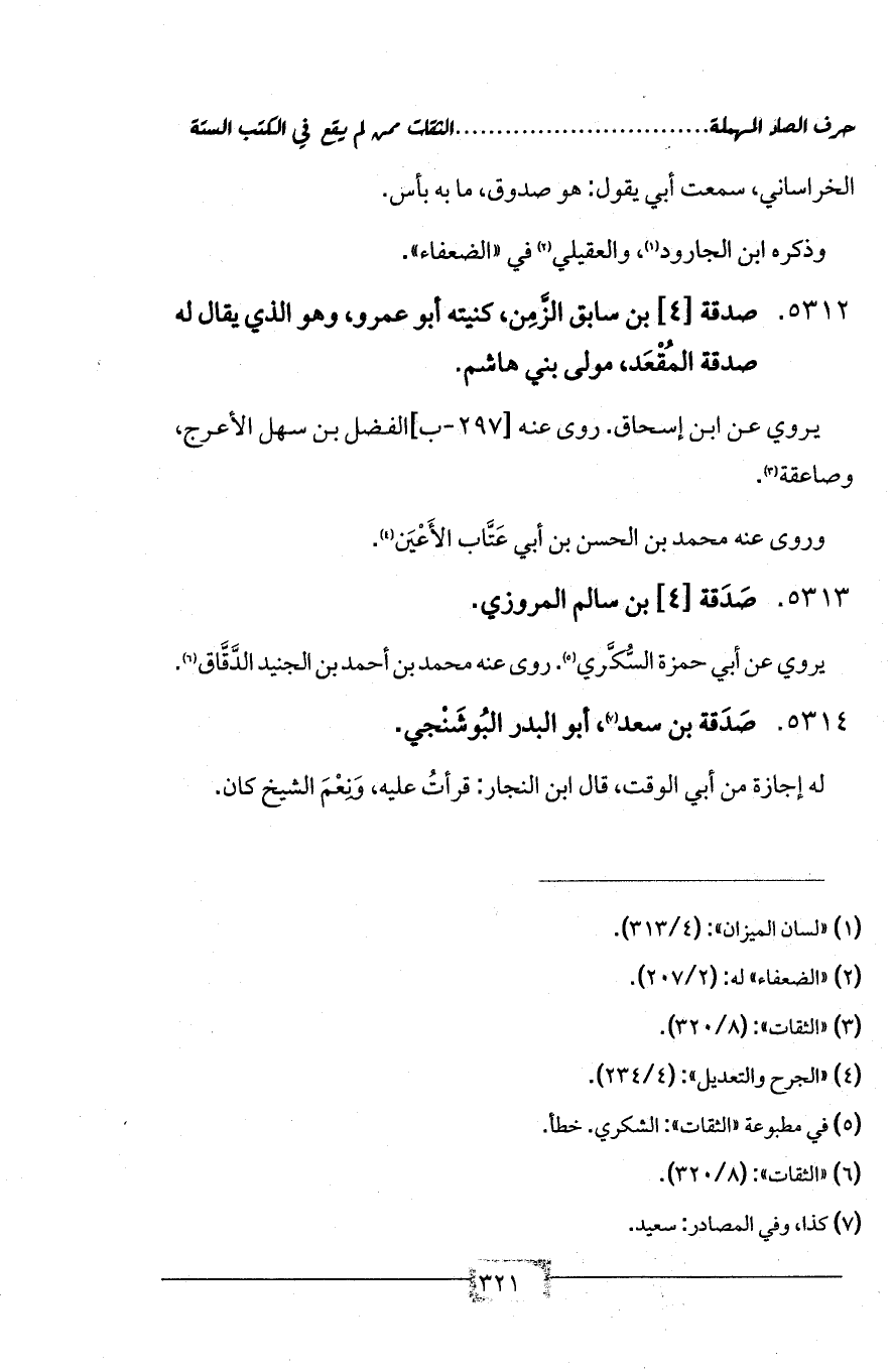 5312 - صدقة [4] بن سابق الزَّمِن، كنيته أبو عمرو، وهو الذي يقال له صدقة المُقْعَد، مولى بني هاشم.
