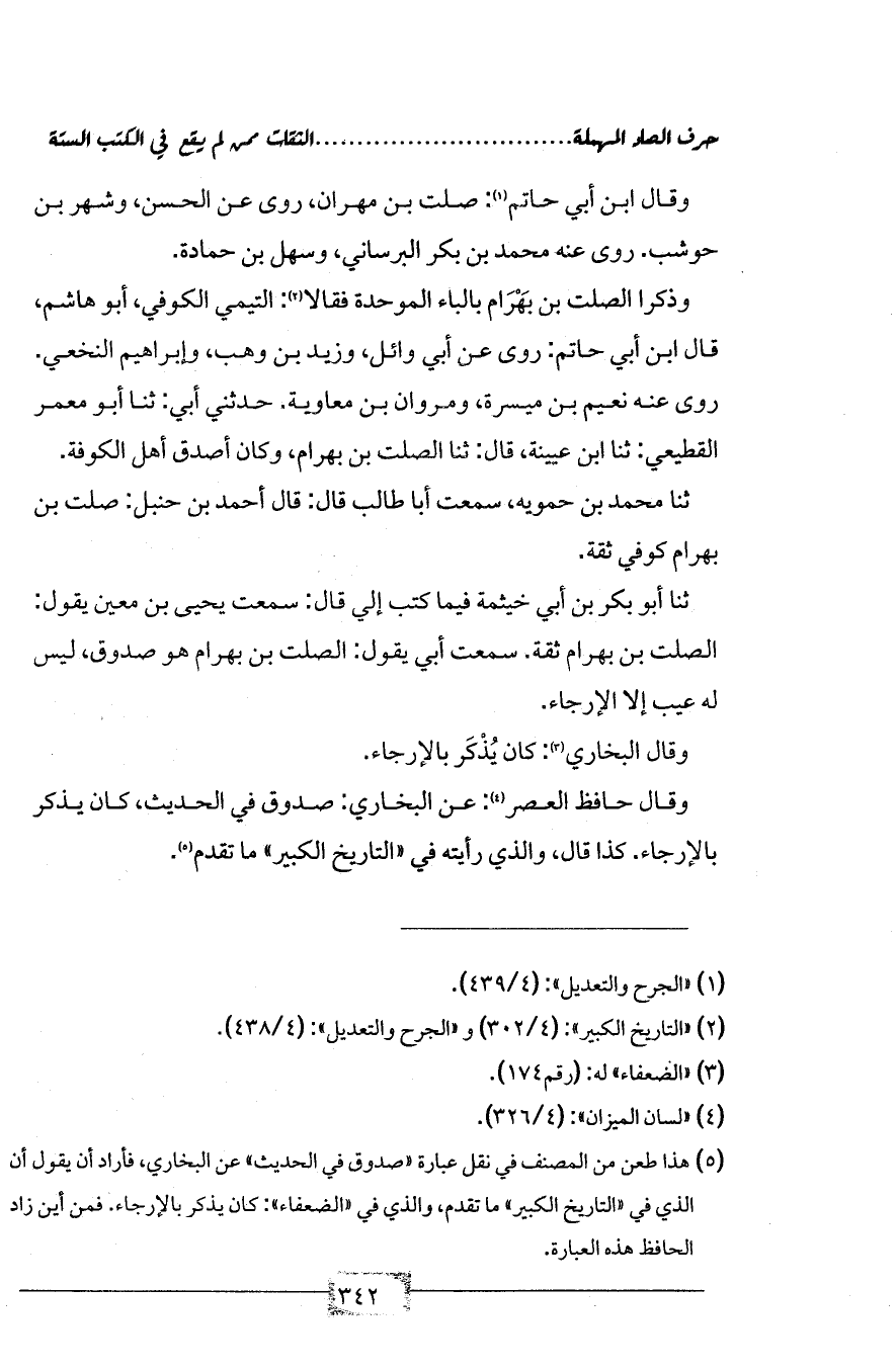 (¬5) هذا طعن من المصنف في نقل عبارة «صدوق في الحديث» عن البخاري، فأراد أن يقول أن الذي في «التاريخ الكبير» ما تقدم، والذي في «الضعفاء»: كان يذكر بالإرجاء. فمن أين زاد الحافظ هذه العبارة.
