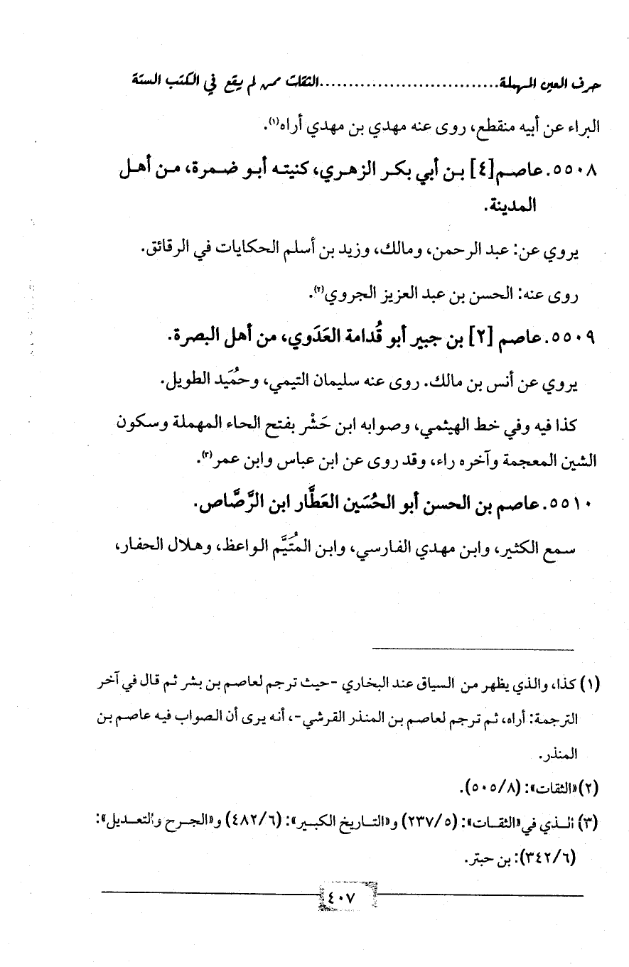(¬1) كذا، والذي يظهر من السياق عند البخاري -حيث ترجم لعاصم بن بشر ثم قال في آخر الترجمة: أراه، ثم ترجم لعاصم بن المنذر القرشي-، أنه يرى أن الصواب فيه عاصم بن المنذر.