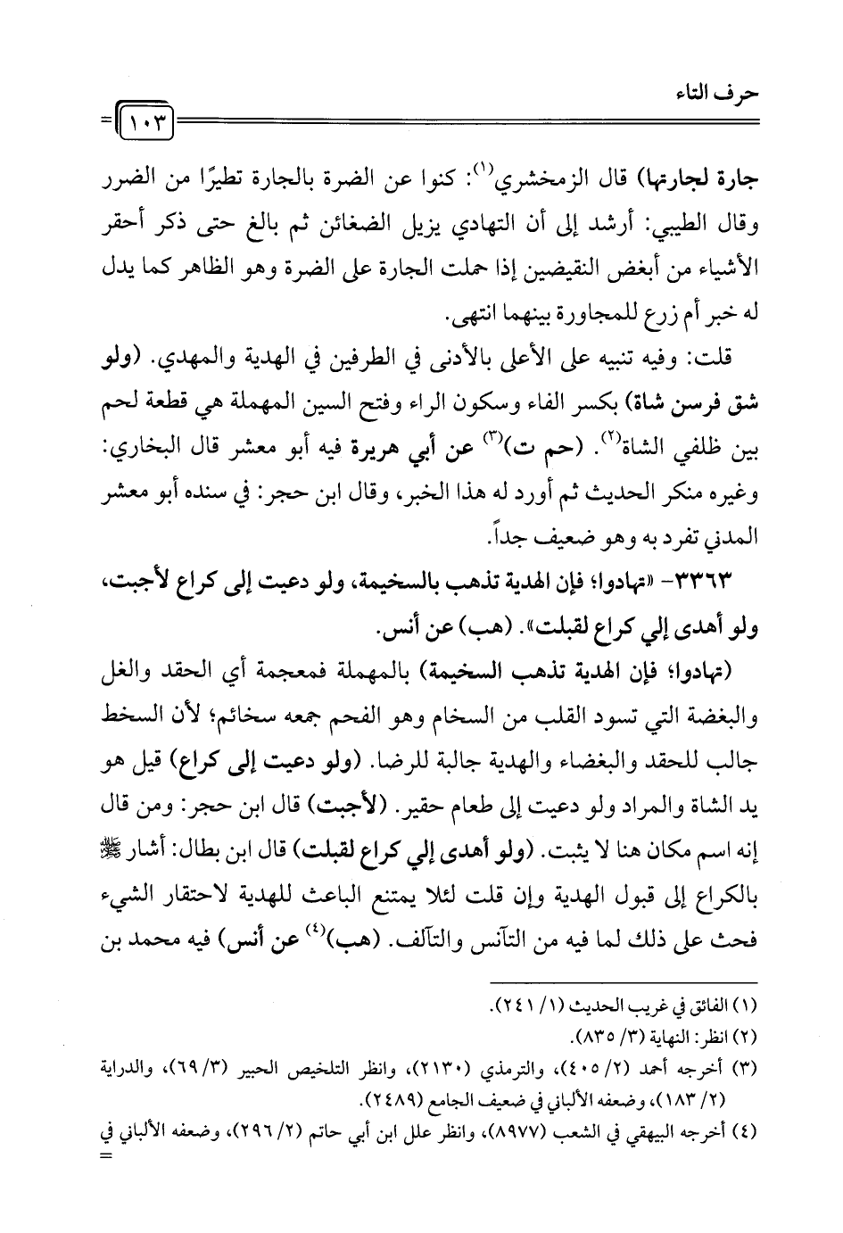 3363 - "تهادوا؛ فإن الهدية تذهب بالسخيمة، ولو دعيت إلى كراع لأجبت، ولو أهدى إلي كراع لقبلت". (هب) عن أنس.