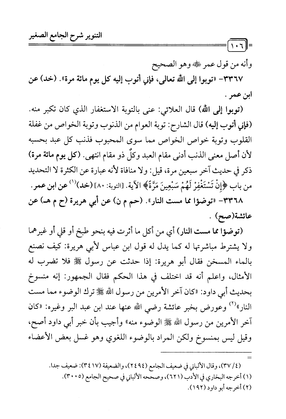 3368 - "توضؤا مما مست النار". (حم م ن) عن أبي هريرة (ح م هـ) عن عائشة (صح).