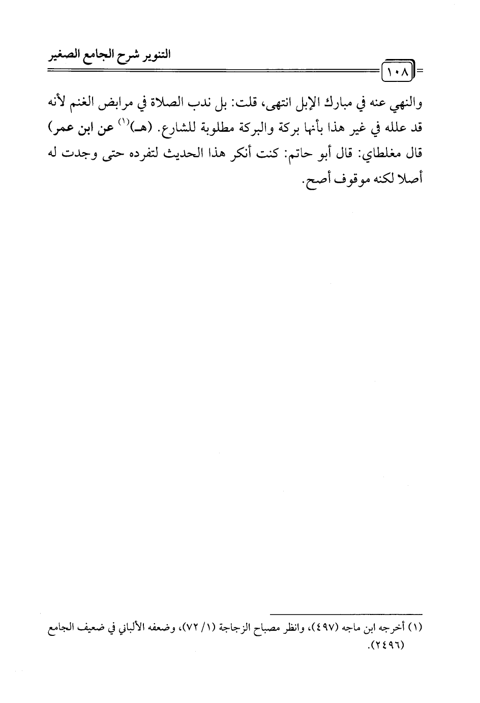 والنهي عنه في مبارك الإبل انتهى، قلت: بل ندب الصلاة في مرابض الغنم لأنه قد علله في غير هذا بأنها بركة والبركة مطلوبة للشارع. (هـ) (¬1) عن ابن عمر) قال مغلطاي: قال أبو حاتم: كنت أنكر هذا الحديث لتفرده حتى وجدت له أصلاً لكنه موقوف أصح.