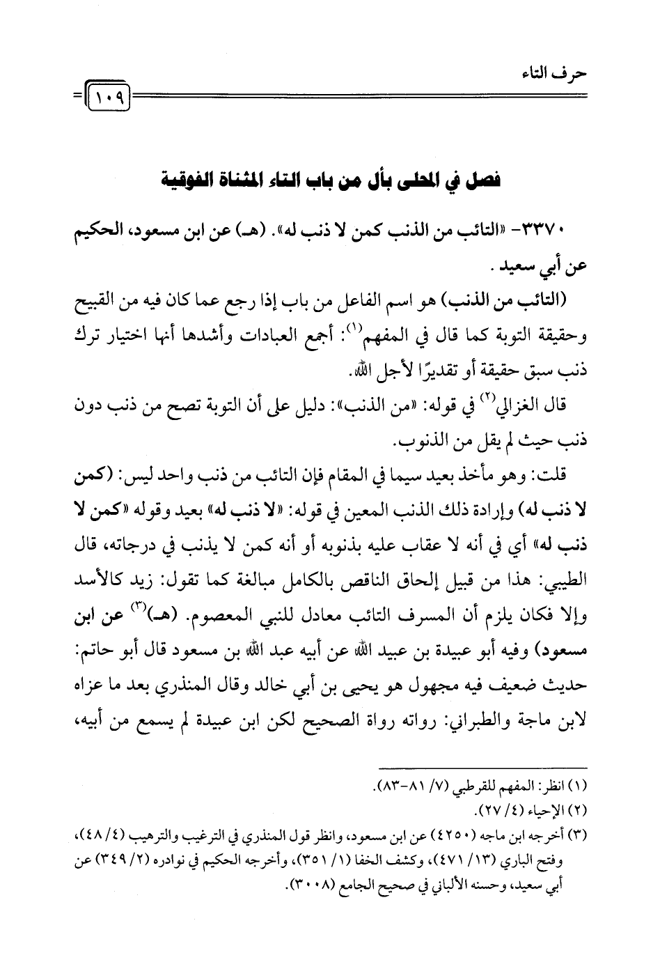 3370 - " التائب من الذنب كمن لا ذنب له". (هـ) عن ابن مسعود، الحكيم عن أبي سعيد.