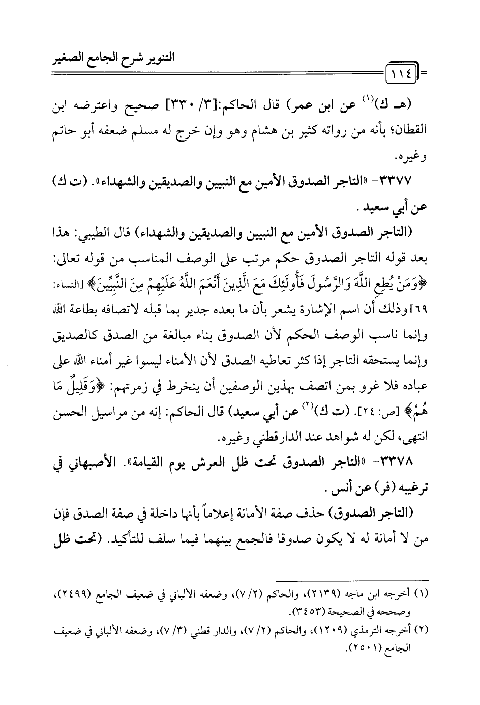 3378 - "التاجر الصدوق تحت ظل العرش يوم القيامة". الأصبهاني في ترغيبه (فر) عن أنس.