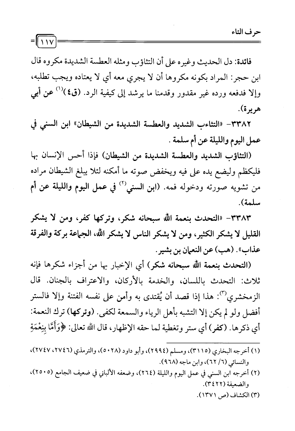 3382 - "التثاءب الشديد والعطسة الشديدة من الشيطان" ابن السني في عمل اليوم والليلة عن أم سلمة.