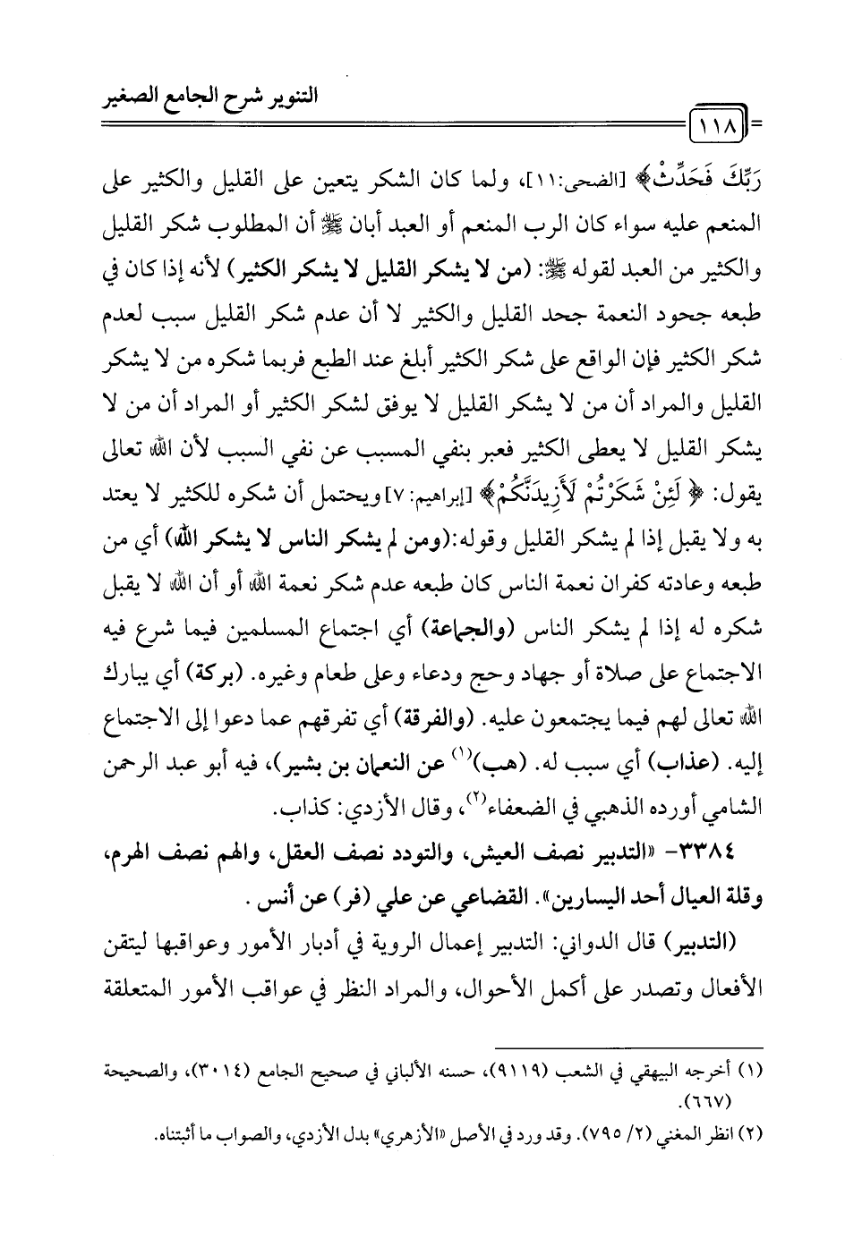 رَبِّكَ فَحَدِّثْ} [الضحى:11]، ولما كان الشكر يتعين على القليل والكثير على المنعم عليه سواء كان الرب المنعم أو العبد أبان - صلى الله عليه وسلم - أن المطلوب شكر القليل والكثير من العبد لقوله - صلى الله عليه وسلم -: (من لا يشكر القليل لا يشكر الكثير) لأنه إذا كان في طبعه جحود النعمة جحد القليل والكثير لا أن عدم شكر القليل سبب لعدم شكر الكثير فإن الواقع على شكر الكثير أبلغ عند الطبع فربما شكره من لا يشكر القليل والمراد أن من لا يشكر القليل لا يوفق لشكر الكثير أو المراد أن من لا يشكر القليل لا يعطى الكثير فعبر بنفي المسبب عن نفي السبب لأن الله تعالى يقول: {لَئِنْ شَكَرْتُمْ لَأَزِيدَنَّكُمْ} [إبراهيم: 7] ويحتمل أن شكره للكثير لا يعتد به ولا يقبل إذا لم يشكر القليل وقوله: (ومن لم يشكر الناس لا يشكر الله) أي من طبعه وعادته كفران نعمة الناس كان طبعه عدم شكر نعمة الله أو أن الله لا يقبل شكره له إذا لم يشكر الناس (والجماعة) أي اجتماع المسلمين فيما شرع فيه الاجتماع على صلاة أو جهاد وحج ودعاء وعلى طعام وغيره. (بركة) أي يبارك الله تعالى لهم فيما يجتمعون عليه. (والفرقة) أي تفرقهم عما دعوا إلى الاجتماع إليه. (عذاب) أي سبب له. (هب) (¬1) عن النعمان بن بشير)، فيه أبو عبد الرحمن الشامي أورده الذهبي في الضعفاء (¬2)، وقال الأزدي: كذاب.