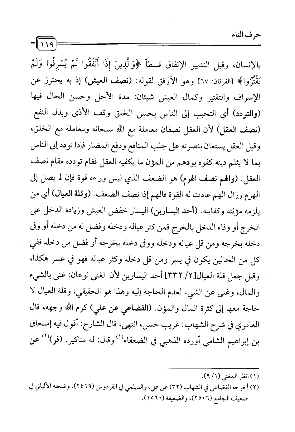 (¬2) أخرجه القضاعي في الشهاب (32) عن علي، والديلمي في الفردوس (2419)، وضعفه الألباني في ضعيف الجامع (2506)، والضعيفة (1560).