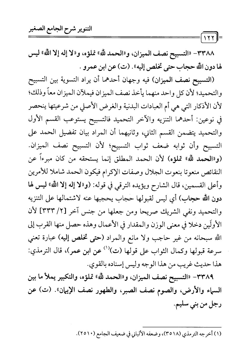 3389 - "التسبيح نصف الميزان، و"الحمد لله" تملؤه، والتكبير يملأ ما بين السماء والأرض، والصوم نصف الصبر، والطهور نصف الإيمان". (ت) عن رجل من بني سليم.