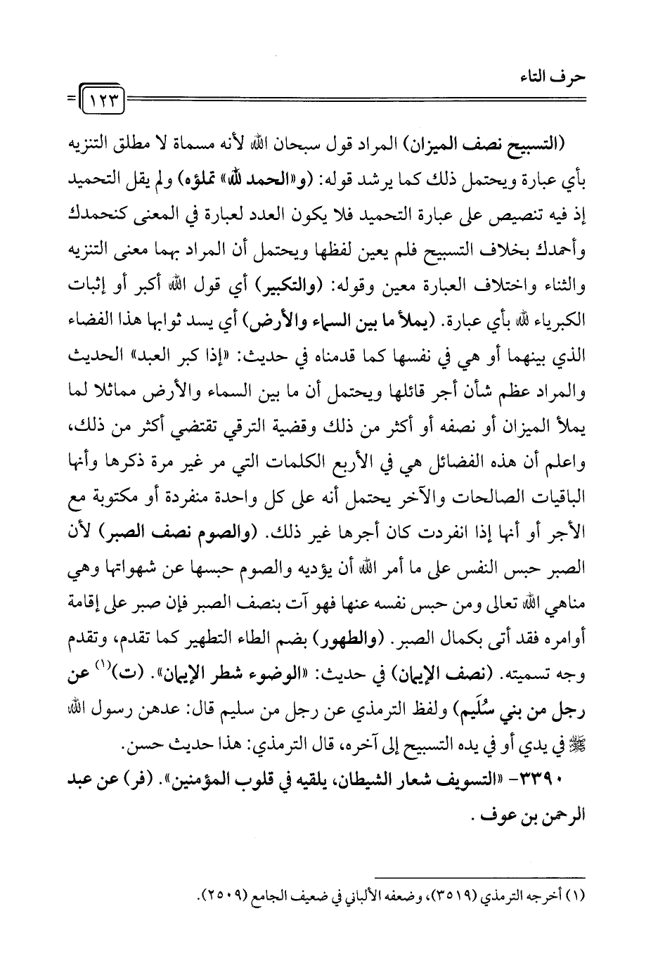 (التسبيح نصف الميزان) المراد قول سبحان الله لأنه مسماة لا مطلق التنزيه بأي عبارة ويحتمل ذلك كما يرشد قوله: (و"الحمد لله" تملؤه) ولم يقل التحميد إذ فيه تنصيص على عبارة التحميد فلا يكون العدد لعبارة في المعنى كنحمدك وأحمدك بخلاف التسبيح فلم يعين لفظها ويحتمل أن المراد بهما معنى التنزيه والثناء واختلاف العبارة معين وقوله: (والتكبير) أي قول الله أكبر أو إثبات الكبرياء لله بأي عبارة. (يملأ ما بين السماء والأرض) أي يسد ثوابها هذا الفضاء الذي بينهما أو هي في نفسها كما قدمناه في حديث: "إذا كبر العبد" الحديث والمراد عظم شأن أجر قائلها ويحتمل أن ما بين السماء والأرض مماثلا لما يملأ الميزان أو نصفه أو أكثر من ذلك وقضية الترقي تقتضي أكثر من ذلك، واعلم أن هذه الفضائل هي في الأربع الكلمات التي مر غير مرة ذكرها وأنها الباقيات الصالحات والآخر يحتمل أنه على كل واحدة منفردة أو مكتوبة مع الأجر أو أنها إذا انفردت كان أجرها غير ذلك. (والصوم نصف الصبر) لأن الصبر حبس النفس على ما أمر الله أن يؤديه والصوم حبسها عن شهواتها وهي مناهي الله تعالى ومن حبس نفسه عنها فهو آت بنصف الصبر فإن صبر على إقامة أوامره فقد أتى بكمال الصبر. (والطهور) بضم الطاء التطهير كما تقدم، وتقدم وجه تسميته. (نصف الإيمان) في حديث: "الوضوء شطر الإيمان". (ت) (¬1) عن رجل من بني سُلَيم) ولفظ الترمذي عن رجل من سليم قال: عدهن رسول الله - صلى الله عليه وسلم - في يدي أو في يده التسبيح إلى آخره، قال الترمذي: هذا حديث حسن.