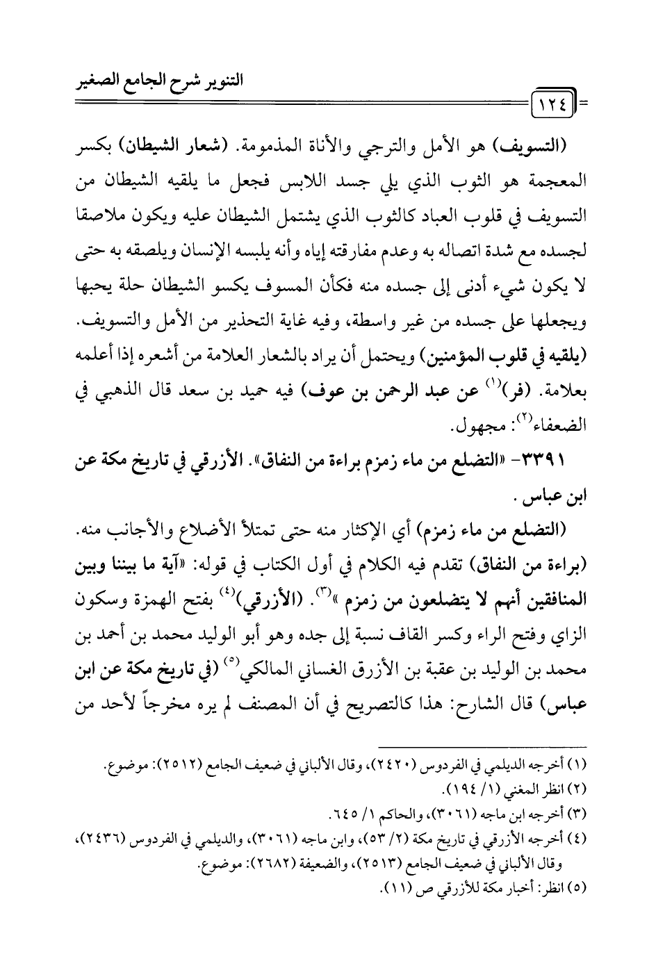 3391 - "التضلع من ماء زمزم براءة من النفاق". الأزرقي في تاريخ مكة عن ابن عباس.