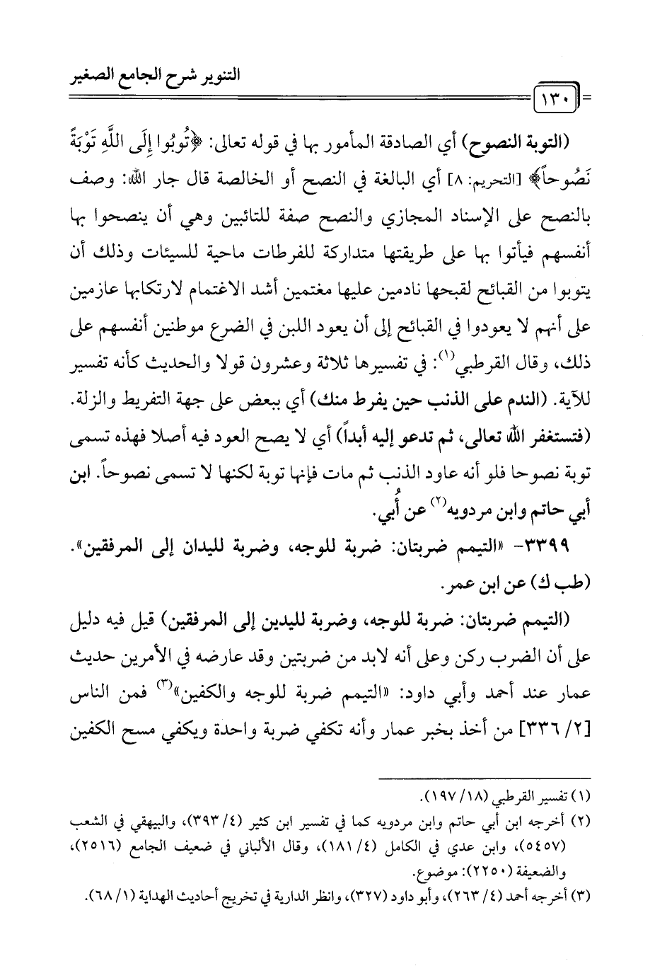 3399 - "التيمم ضربتان: ضربة للوجه، وضربة لليدان إلى المرفقين". (طب ك) عن ابن عمر.