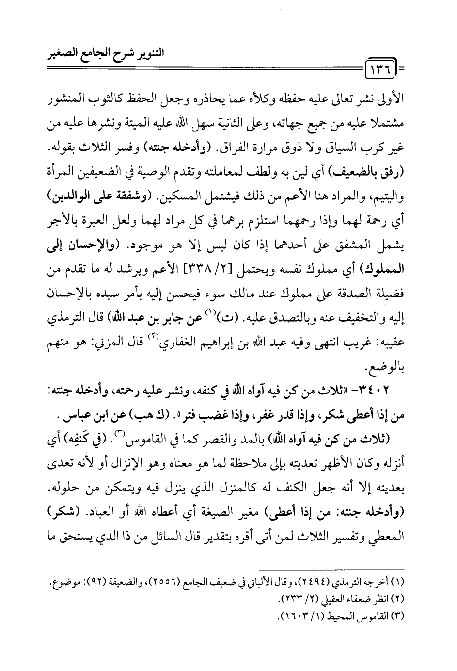 الأولى نشر تعالى عليه حفظه وكلأه عما يحاذره وجعل الحفظ كالثوب المنشور مشتملا عليه من جميع جهاته، وعلى الثانية سهل الله عليه الميتة ونشرها عليه من غير كرب السياق ولا ذوق مرارة الفراق. (وأدخله جنته) وفسر الثلاث بقوله. (رفق بالضعيف) أي لين به ولطف لمعاملته وتقدم الوصية في الضعيفين المرأة واليتيم، والمراد هنا الأعم من ذلك فيشتمل المسكين. (وشفقة على الوالدين) أي رحمة لهما وإذا رحمهما استلزم برهما في كل مراد لهما ولعل العبرة بالأجر يشمل المشفق على أحدهما إذا كان ليس إلا هو موجود. (والإحسان إلى المملوك) أي مملوك نفسه ويحتمل [2/ 338]، الأعم ويرشد له ما تقدم من فضيلة الصدقة على مملوك عند مالك سوء فيحسن إليه بأمر سيده بالإحسان إليه والتخفيف عنه وبالتصدق عليه. (ت) (¬1) عن جابر بن عبد الله) قال الترمذي عقيبه: غريب انتهى وفيه عبد الله بن إبراهيم الغفاري (¬2) قال المزني: هو متهم بالوضع.
