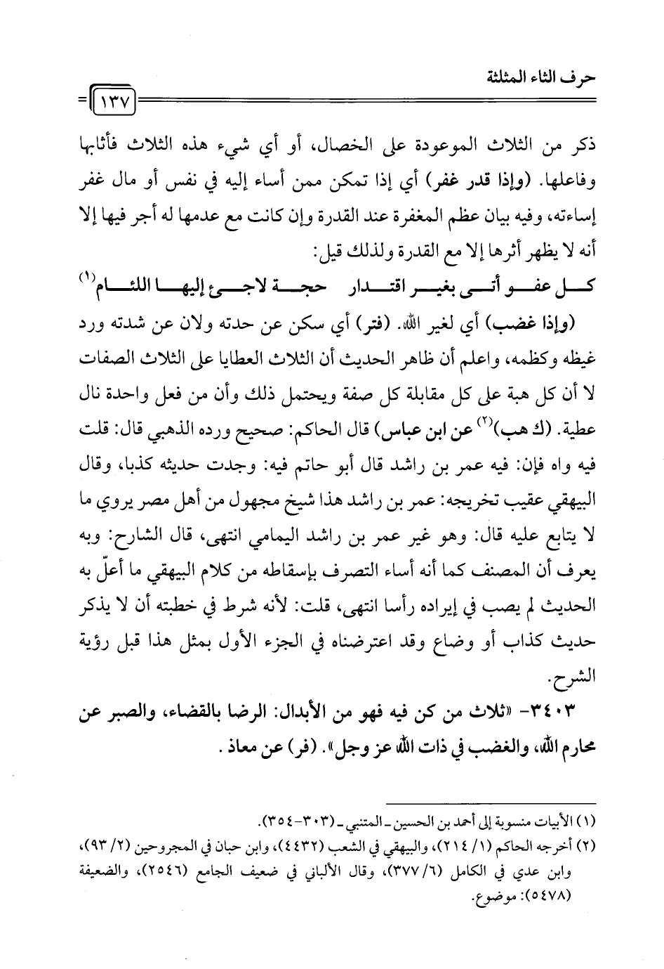 3403 - "ثلاث من كن فيه فهو من الأبدال: الرضا بالقضاء، والصبر عن محارم الله، والغضب في ذات الله عَزَّ وَجَلَّ ". (فر) عن معاذ.