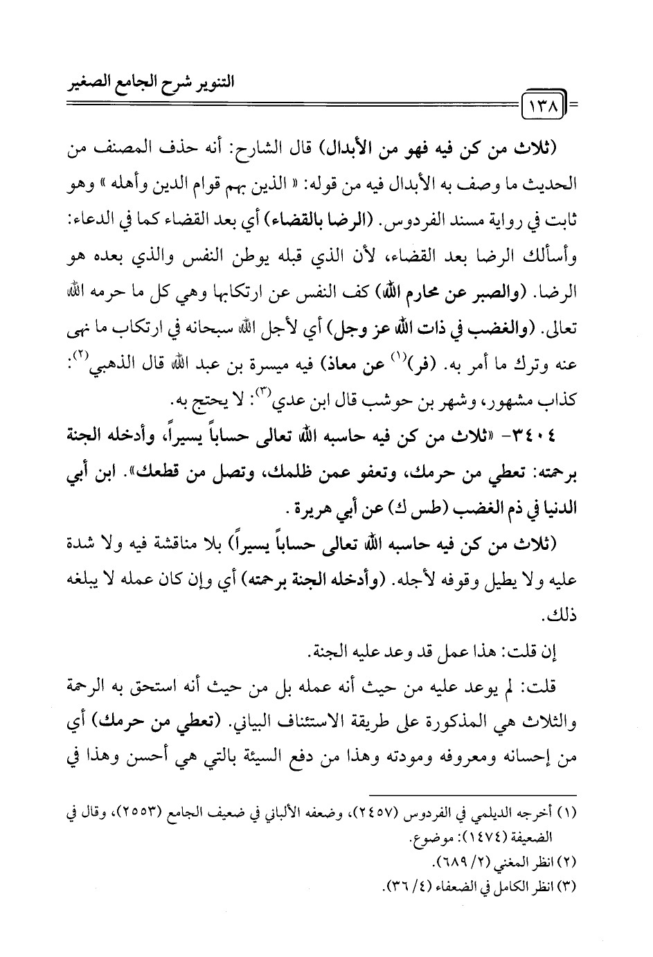 (ثلاث من كن فيه فهو من الأبدال) قال الشارح: أنه حذف المصنف من الحديث ما وصف به الأبدال فيه من قوله: "الذين بهم قوام الدين وأهله" وهو ثابت في رواية مسند الفردوس. (الرضا بالقضاء) أي بعد القضاء كما في الدعاء: وأسألك الرضا بعد القضاء، لأن الذي قبله يوطن النفس والذي بعده هو الرضا. (والصبر عن محارم الله) كف النفس عن ارتكابها وهي كل ما حرمه الله تعالى. (والغضب في ذات الله عَزَّ وَجَلَّ) أي لأجل الله سبحانه في ارتكاب ما نهى عنه وترك ما أمر به. (فر) (¬1) عن معاذ) فيه ميسرة بن عبد الله قال الذهبي (¬2): كذاب مشهور، وشهر بن حوشب قال ابن عدي (¬3): لا يحتج به.