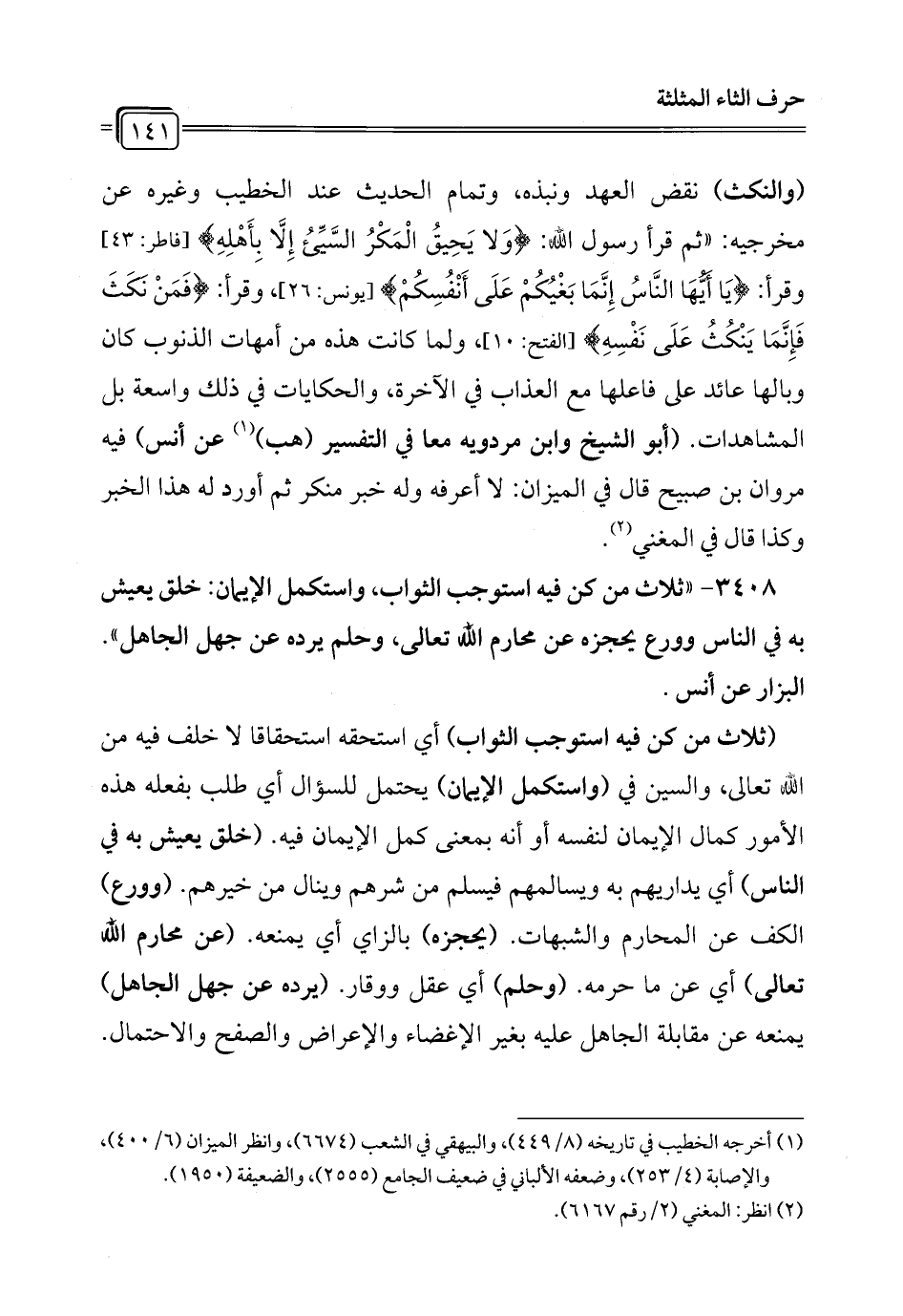 3408 - "ثلاث من كن فيه استوجب الثواب، واستكمل الإيمان: خلق يعيش به في الناس وورع يحجزه عن محارم الله تعالى، وحلم يرده عن جهل الجاهل". البزار عن أنس.