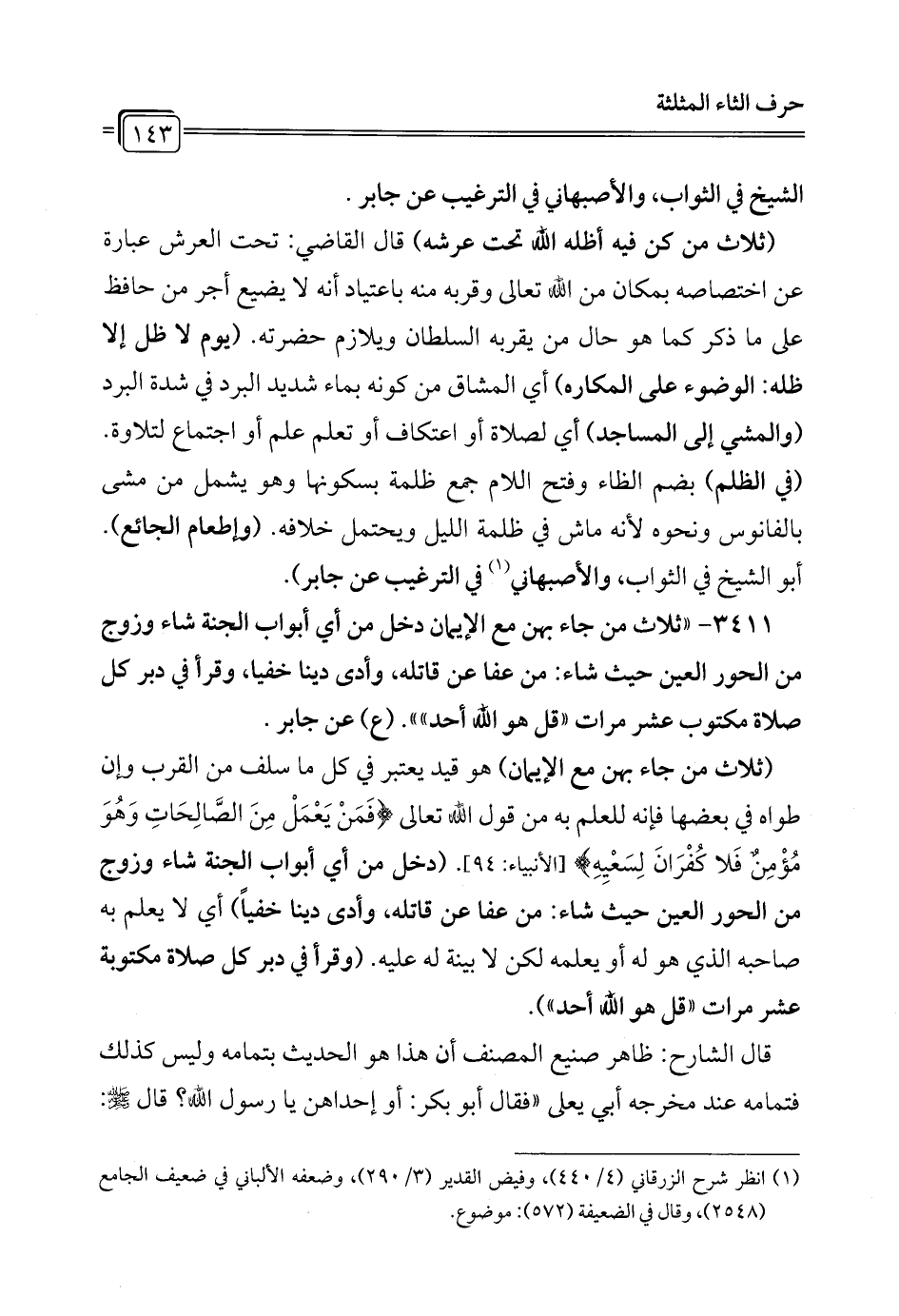 3411 - "ثلاث من جاء بهن مع الإيمان دخل من أي أبواب الجنة شاء وزوج من الحور العين حيث شاء: من عفا عن قاتله، وأدى دينا خفيا، وقرأ في دبر كل صلاة مكتوب عشر مرات" قل هو الله أحد"". (ع) عن جابر.
