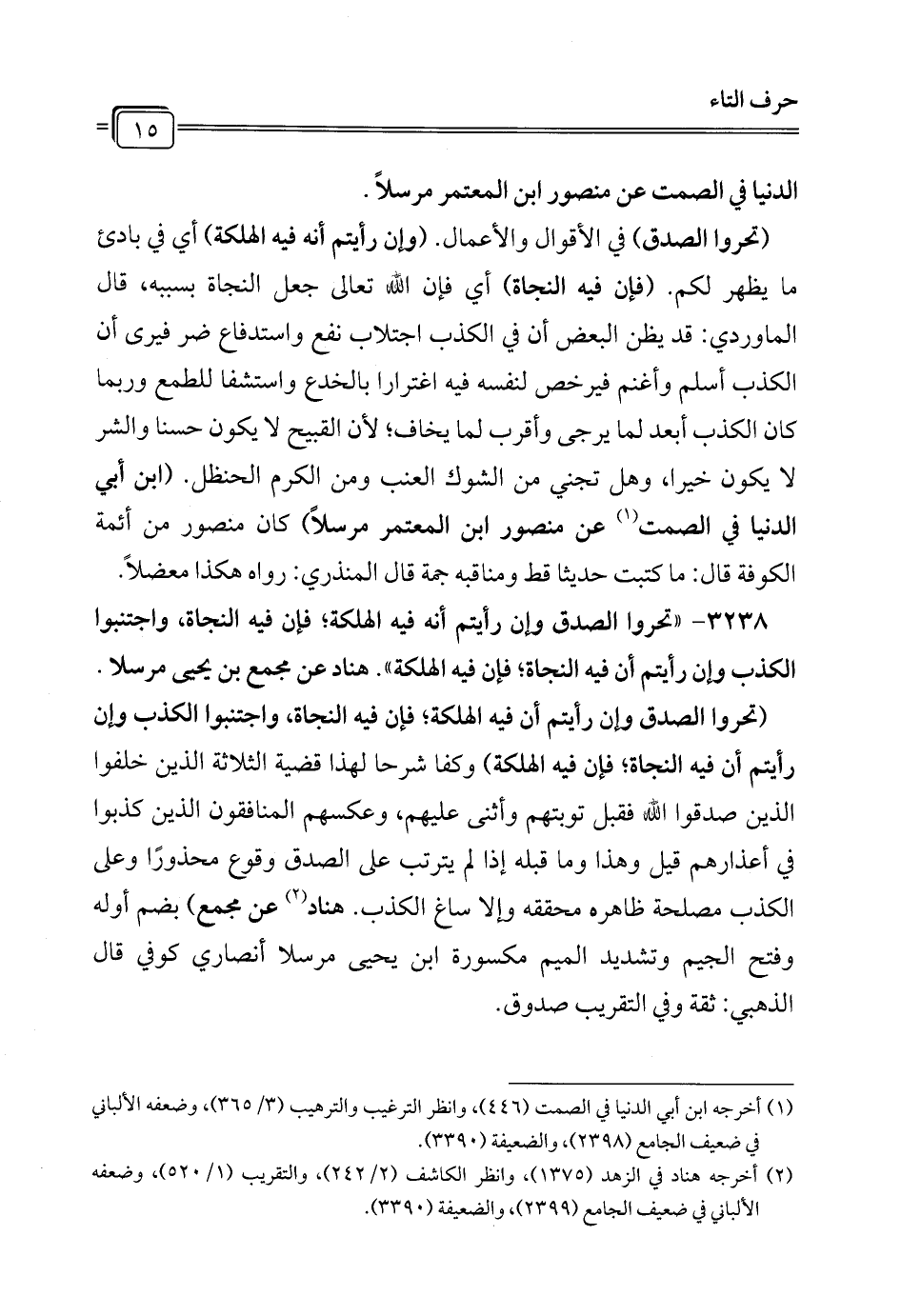 (تحروا الصدق) في الأقوال والأعمال. (وإن رأيتم أنه فيه الهلكة) أي في بادئ ما يظهر لكم. (فإن فيه النجاة) أي فإن الله تعالى جعل النجاة بسببه، قال الماوردي: قد يظن البعض أن في الكذب اجتلاب نفع واستدفاع ضر فيرى أن الكذب أسلم وأغنم فيرخص لنفسه فيه اغترارا بالخدع واستشفا للطمع وربما كان الكذب أبعد لما يرجى وأقرب لما يخاف؛ لأن القبيح لا يكون حسناً والشر لا يكون خيراً، وهل تجني من الشوك العنب ومن الكرم الحنظل. (ابن أبي الدنيا في الصمت (¬1) عن منصور ابن المعتمر مرسلاً) كان منصور من أئمة الكوفة قال: ما كتبت حديثاً قط ومناقبه جمة قال المنذري: رواه هكذا معضلاً.