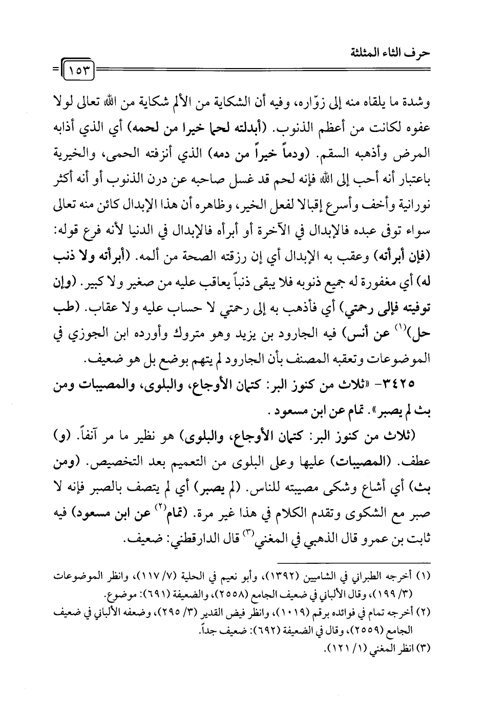 3425 - "ثلاث من كنوز البر: كتمان الأوجاع، والبلوى، والمصيبات ومن بث لم يصبر". تمام عن ابن مسعود.