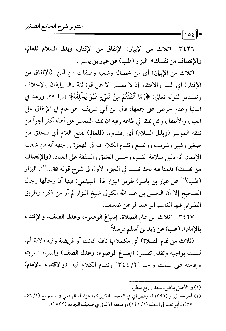 3426 - "ثلاث من الإيمان: الإنفاق من الإقتار، وبذل السلام للعالم، والإنصاف من نفسك". البزار (طب) عن عمار بن ياسر.