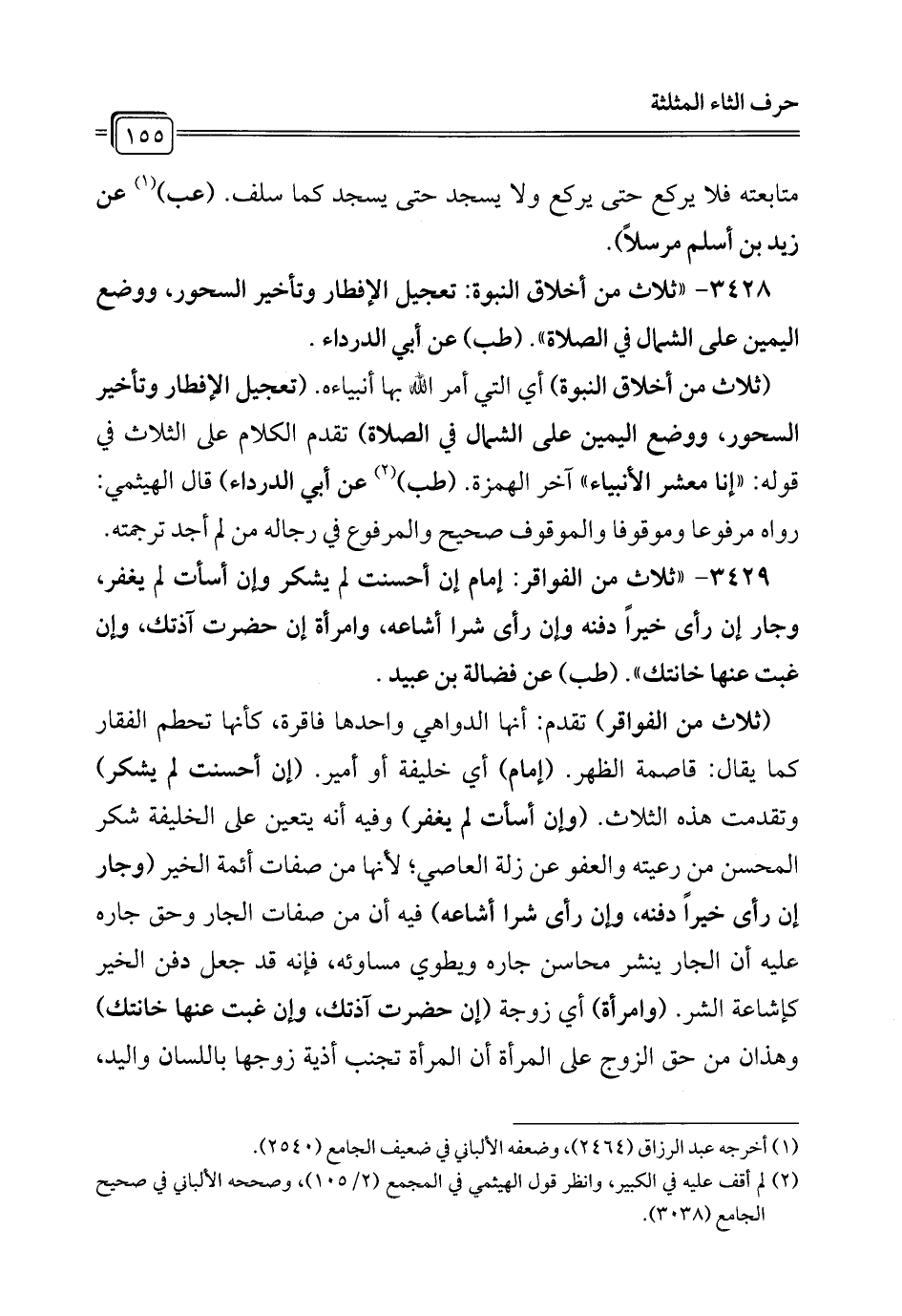 3428 - "ثلاث من أخلاق النبوة: تعجيل الإفطار وتأخير السحور، ووضع اليمين على الشمال في الصلاة". (طب) عن أبي الدرداء.