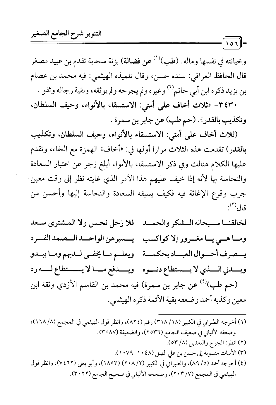 3430 - "ثلاث أخاف على أمتي: الاستسقاء بالأنواء، وحيف السلطان، وتكذيب بالقدر". (حم طب) عن جابر بن سمرة.