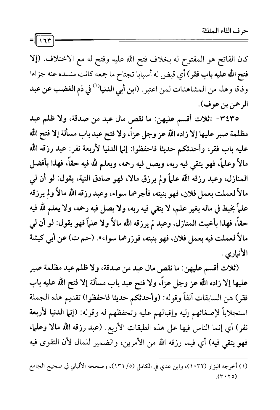 (ثلاث أقسم عليهن: ما نقص مال عبد من صدقة، ولا ظلم عبد مظلمة صبر عليها إلا زاده الله عَزَّ وَجَلَّ عزاً، ولا فتح عبد باب مسألة إلا فتح الله عليه باب فقر) هن السابقات آنفاً وقوله: (وأحدثكم حديثا فاحفظوا) تقديم هذه الجملة استجلاباً لإصغائهم إليه وإقبالهم عليه وتحفظهم له وقوله: (إنما الدنيا لأربعة نفر) أي إنما الناس فيها على هذه الطبقات الأربع. (عبد رزقه الله مالاً وعلما، فهو يتقي فيه) أي فيما رزقه الله من الأمرين، والضمير للمال لأن التقوى فيه