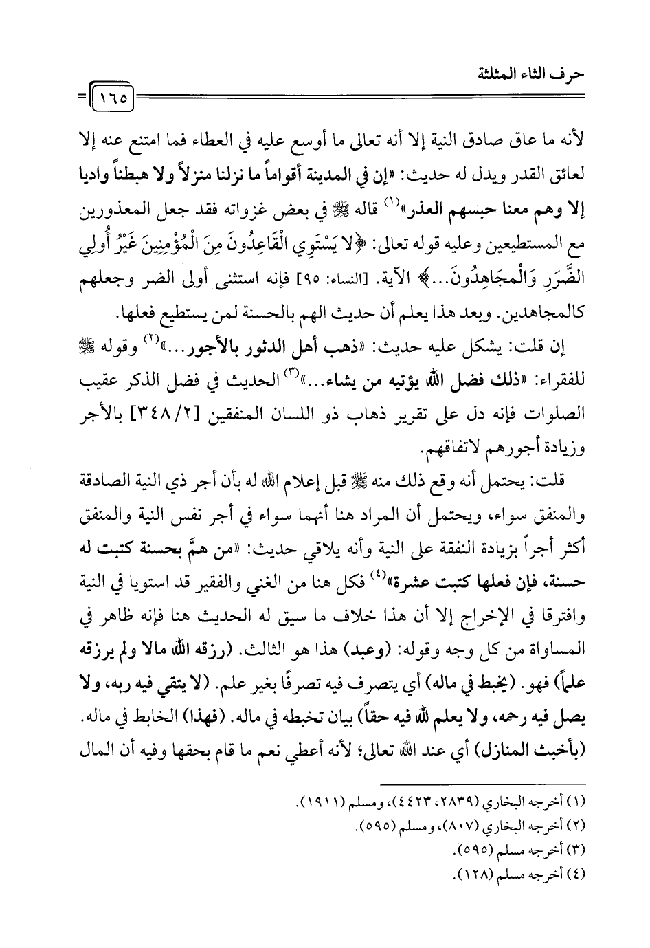لأنه ما عاق صادق النية إلا أنه تعالى ما أوسع عليه في العطاء فما امتنع عنه إلا لعائق القدر ويدل له حديث: "إن في المدينة أقواماً ما نزلنا منزلاً ولا هبطنًا وادياً إلا وهم معنا حبسهم العذر" (¬1) قاله - صلى الله عليه وسلم - في بعض غزواته فقد جعل المعذورين مع المستطيعين وعليه قوله تعالى: {لا يَسْتَوِي الْقَاعِدُونَ مِنَ الْمُؤْمِنِينَ غَيْرُ أُولِي الضَّرَرِ وَالْمجَاهِدُونَ ...} الآية. [النساء: 95] فإنه استثنى أولى الضر وجعلهم كالمجاهدين. وبعد هذا يعلم أن حديث الهم بالحسنة لمن يستطيع فعلها.