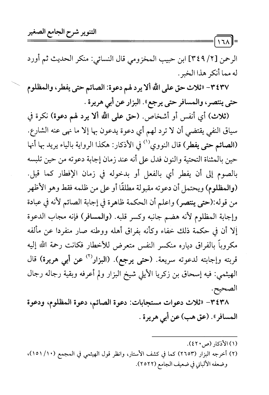 (ثلاث) أي أنفس أو أشخاص. (حق على الله ألا يرد لهم دعوة) نكرة في سياق النفي يقتضي أن لا ترد لهم أي دعوة يدعون بها إلا ما نهى عنه الشارع. (الصائم حتى يفطر) قال النووي (¬1) في الأذكار: هكذا الرواية بالياء يريد بها أنها حين بالمثناة التحتية والنون فدل على أنه عند زمان إجابة دعوته من حين تلبسه بالصوم إلى أن يفطر أي بالفعل أو بدخوله في زمان الإفطار كما قيل. (والمظلوم) ويحتمل أن دعوته مقبولة مطلقًا أو على من ظلمه فقط وهو الأظهر من قوله: (حتى ينتصر) واعلم أن الحكمة ظاهرة في إجابة الصائم لأنه في عبادة وإجابة المظلوم لأنه هضم جانبه وكسر قلبه. (والمسافر) فإنه مجاب الدعوة إلا أن في حكمة ذلك خفاء وكأنه بفراق أهله ووطئه صار منفردا عن مألفه مكروباً بالفراق دياره منكسر النفس متعرض للأخطار فكانت رحمة الله إليه قربته وإجابته لدعوته سريعة. (حتى يرجع). (البزار (¬2) عن أبي هريرة) قال الهيثمي: فيه إسحاق بن زكريا الأيلي شيخ البزار ولم أعرفه وبقية رجاله رجال الصحيح.