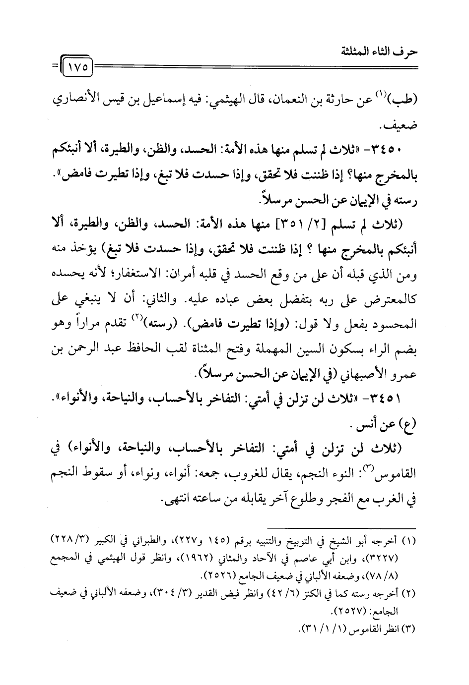 3450 - "ثلاث لم تسلم منها هذه الأمة: الحسد، والظن، والطيرة، ألا أنبئكم بالمخرج منها؟ إذا ظننت فلا تحقق، وإذا حسدت فلا تبغ، وإذا تطيرت فامض". رسته في الإيمان عن الحسن مرسلاً.