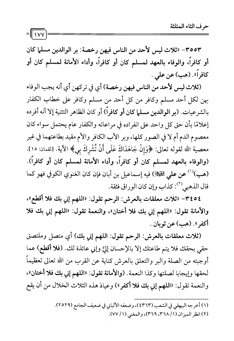 3553 - "ثلاث ليس لأحد من الناس فيهن رخصة: بر الوالدين مسلما كان أو كافراً، والوفاء بالعهد لمسلم كان أو كافراً، وأداء الأمانة لمسلم كان أو كافراً". (هب) عن علي.
