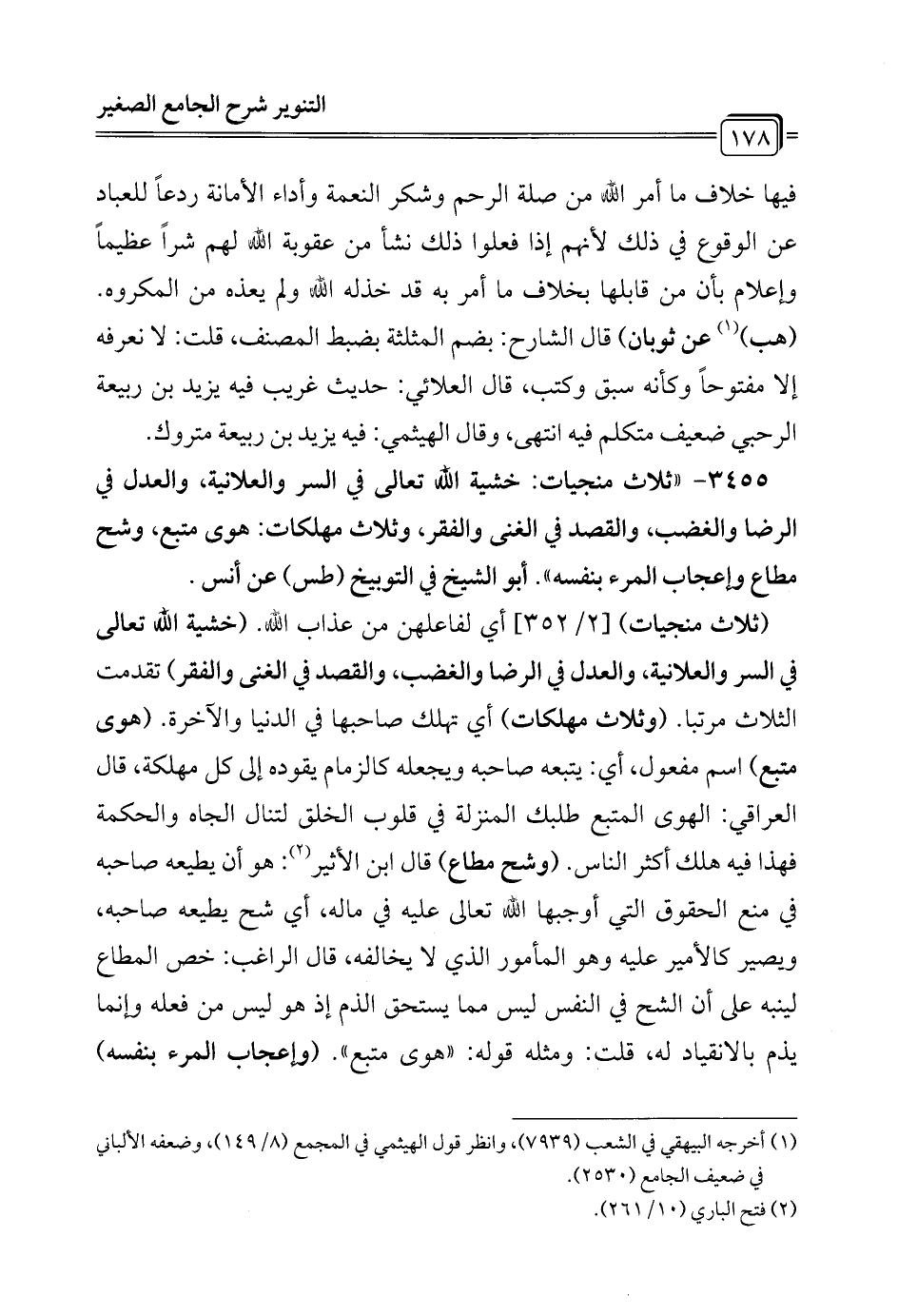 (ثلاث منجيات) [2/ 352] أي لفاعلهن من عذاب الله. (خشية الله تعالى في السر والعلانية، والعدل في الرضا والغضب، والقصد في الغنى والفقر) تقدمت الثلاث مرتبا. (وثلاث مهلكات) أي تهلك صاحبها في الدنيا والآخرة. (هوى متبع) اسم مفعول، أي: يتبعه صاحبه ويجعله كالزمام يقوده إلى كل مهلكة، قال العراقي: الهوى المتبع طلبك المنزلة في قلوب الخلق لتنال الجاه والحكمة فهذا فيه هلك أكثر الناس. (وشح مطاع) قال ابن الأثير (¬2): هو أن يطيعه صاحبه في منع الحقوق التي أوجبها الله تعالى عليه في ماله، أي شح يطيعه صاحبه، ويصير كالأمير عليه وهو المأمور الذي لا يخالفه، قال الراغب: خص المطاع لينبه على أن الشح في النفس ليس مما يستحق الذم إذ هو ليس من فعله وإنما يذم بالانقياد له، قلت: ومثله قوله: "هوى متبع". (وإعجاب المرء بنفسه)
