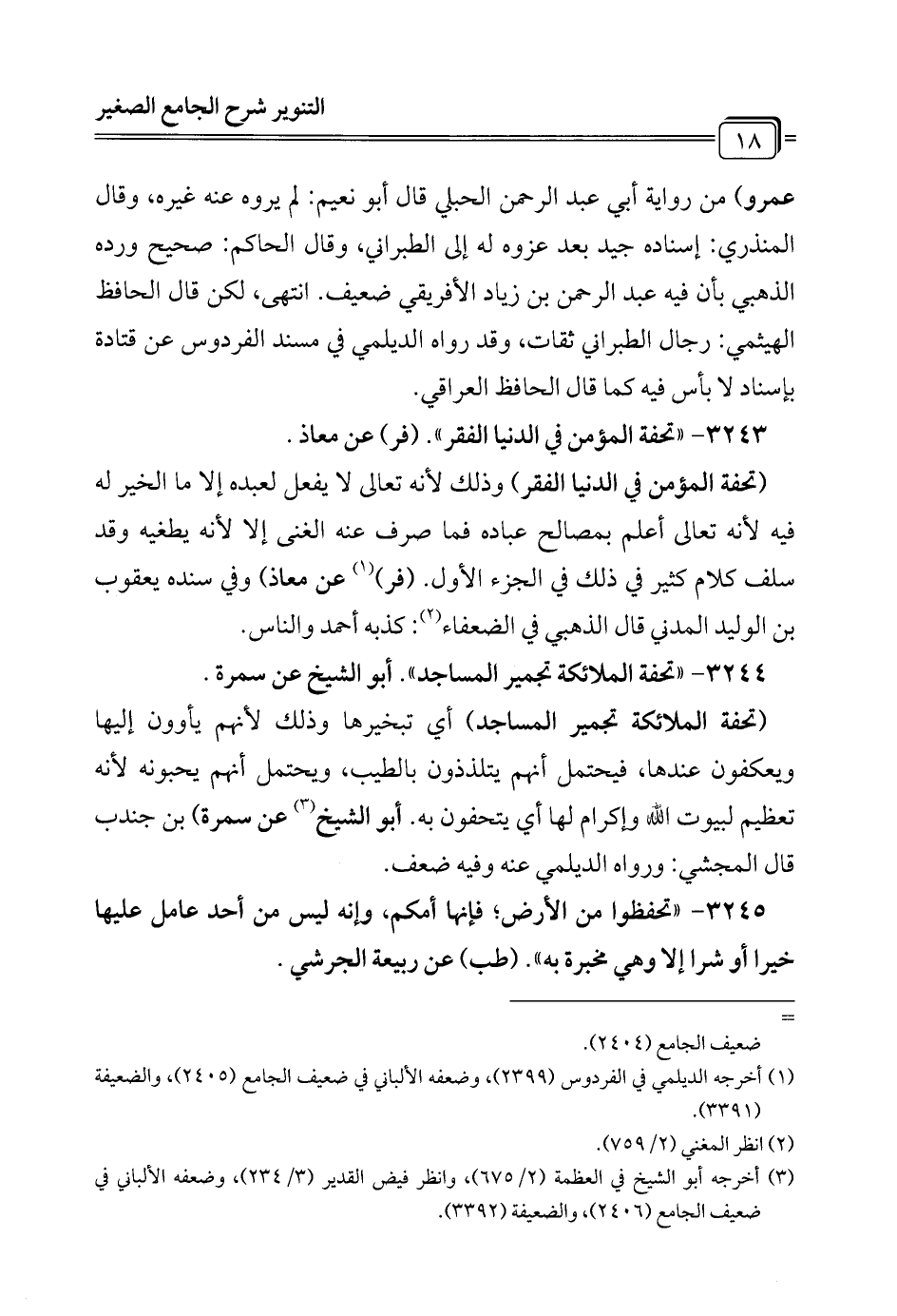 (¬3) أخرجه أبو الشيخ في العظمة (2/ 675)، وانظر فيض القدير (3/ 234)، وضعفه الألباني في ضعيف الجامع (2406)، والضعيفة (3392).
