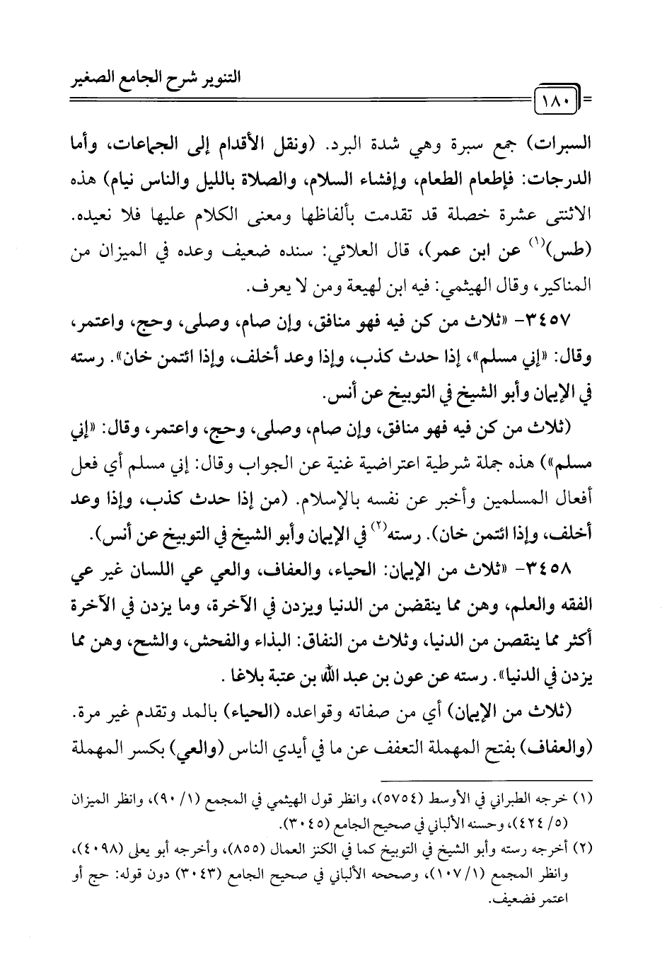 3458 - "ثلاث من الإيمان: الحياء، والعفاف، والعي عي اللسان غير عي الفقه والعلم، وهن مما ينقضن من الدنيا ويزدن في الآخرة، وما يزدن في الآخرة أكثر مما ينقصن من الدنيا، وثلاث من النفاق: البذاء والفحش، والشح، وهن مما يزدن في الدنيا". رسته عن عون بن عبد الله بن عتبة بلاغا.
