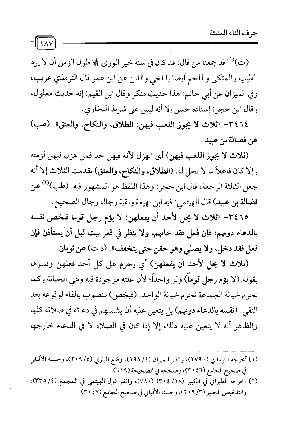 3464 - "ثلاث لا يجوز اللعب فيهن: الطلاق، والنكاح، والعتق". (طب) عن فضالة بن عبيد.
