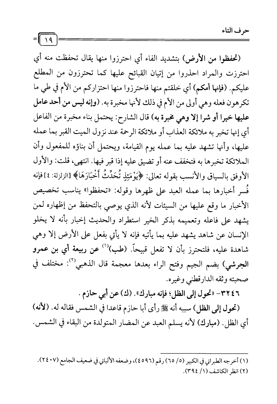 (تحفظوا من الأرض) بتشديد الفاء أي احترزوا منها يقال تحفظت منه أي احترزت والمراد احذروا من إتيان القبائح عليها كما تحترزون من المطلع عليكم. (فإنها أمكم) أي خلقتم منها فاحترزوا منها احتزاركم من الأم في طي ما تكرهون فعله وهي أولى من الأم في ذلك لأنها مخبرة به. (وإنه ليس من أحد عامل عليها خيراً أو شراً إلا وهي مخبرة به) قال الشارح: يحتمل بناء مخبرة من الفاعل أي إنها تخبر به ملائكة العذاب أو ملائكة الرحمة عند نزول الميت القبر بما عمله عليها، وأنها تشهد عليه بما عمله يوم القيامة، ويحتمل أن بناؤه للمفعول وأن الملائكة تخبرها به فتخفف عنه أو تضيق عليه إذا قبر فيها. انتهى، قلت: والأول الأوفق بالسياق والأنسب بقوله تعالى: {يَوْمَئِذٍ تُحَدِّثُ أَخْبَارَهَا} [الزلزلة: 4] فإنه فُسر أخبارها بما عمله العبد على ظهرها وقوله: "تحفظوا" يناسب تخصيص الأخبار ما وقع عليها من السيئات لأنه الذي يوصي بالتحفظ من إظهاره لمن يشهد على فاعله وتعميمه بذكر الخير استطراد والحديث إخبار بأنه لا يخلو الإنسان عن شاهد يشهد عليه بما يأتيه فإنه لا يأتي بفعل على الأرض إلا وهي شاهدة عليه، فلتحترز بأن لا تفعل قبيحاً. (طب) (¬1) عن ربيعة أي بن عمرو الجرشي) بضم الجيم وفتح الراء بعدها معجمة قال الذهبي (¬2): مختلف في صحبته وثقه الدارقطني وغيره.