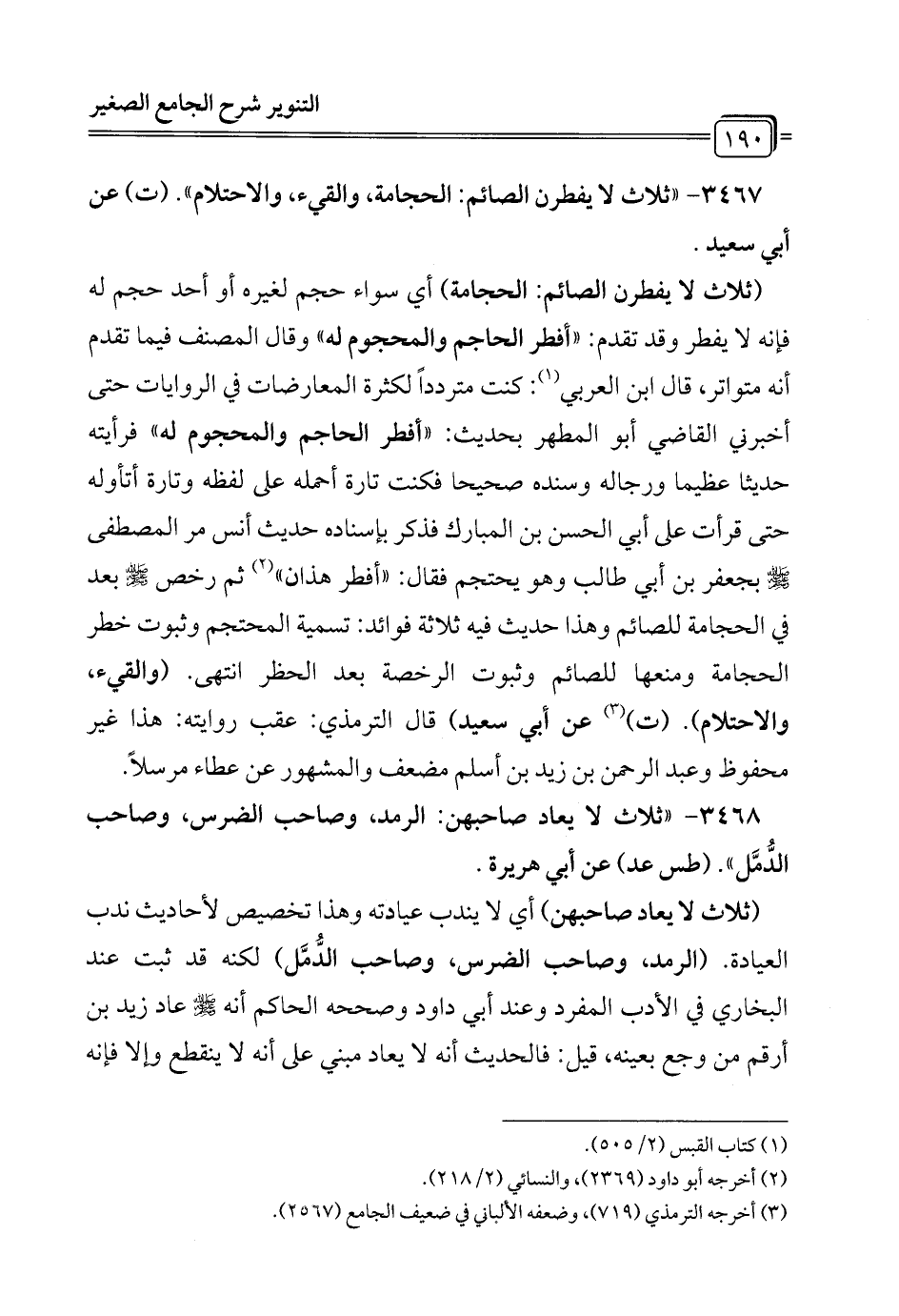 3467 - "ثلاث لا يفطرن الصائم: الحجامة، والقىء، والاحتلام". (ت) عن أبي سعيد.