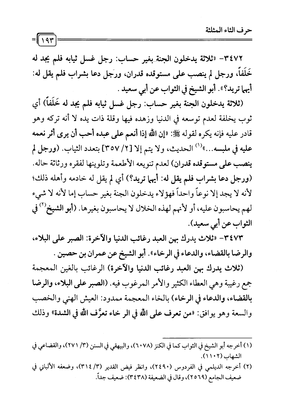 3472 - "ثلاثة يدخلون الجنة بغير حساب: رجل غسل ثيابه فلم يجد له خَلَفاً، ورجل لم ينصب على مستوقده قدران، ورجل دعا بشراب فلم يقل له: أيهما تريد؟ ". أبو الشيخ في الثواب عن أبي سعيد.