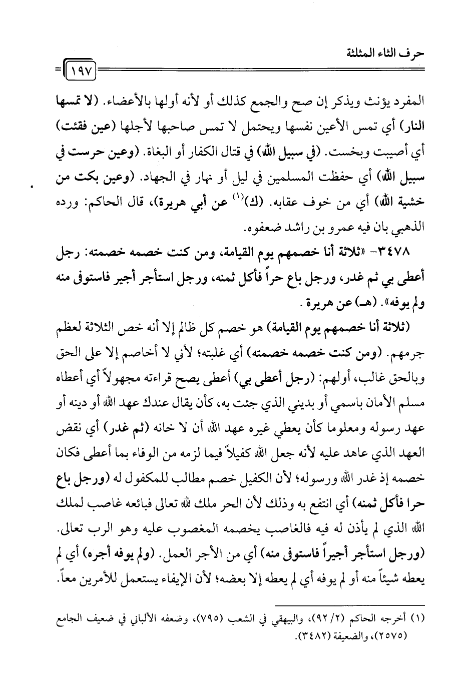 3478 - "ثلاثة أنا خصمهم يوم القيامة، ومن كنت خصمه خصمته: رجل أعطى بي ثم غدر، ورجل باع حراً فأكل ثمنه، ورجل استأجر أجير فاستوفى منه ولم يوفه". (هـ) عن هريرة.